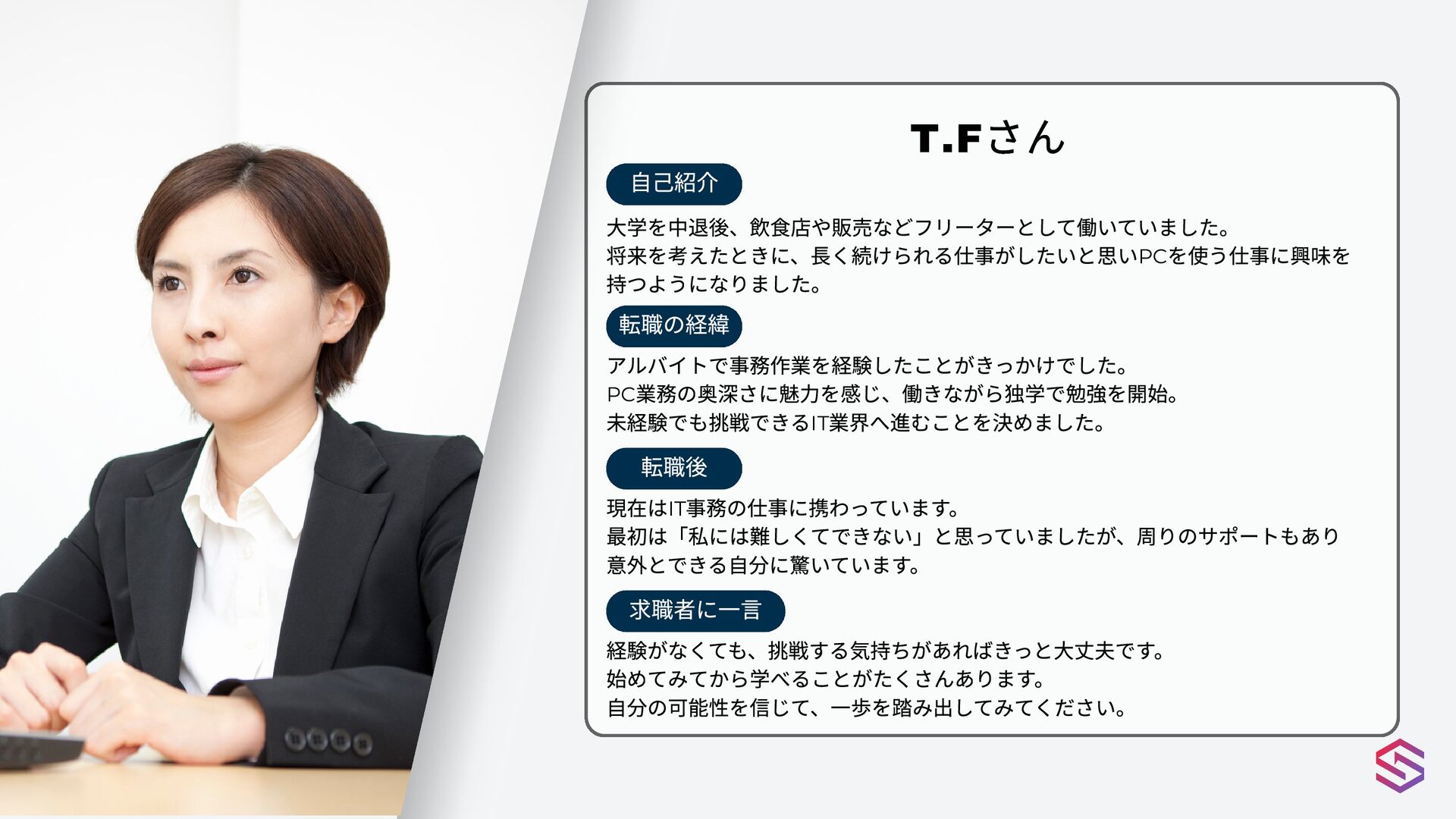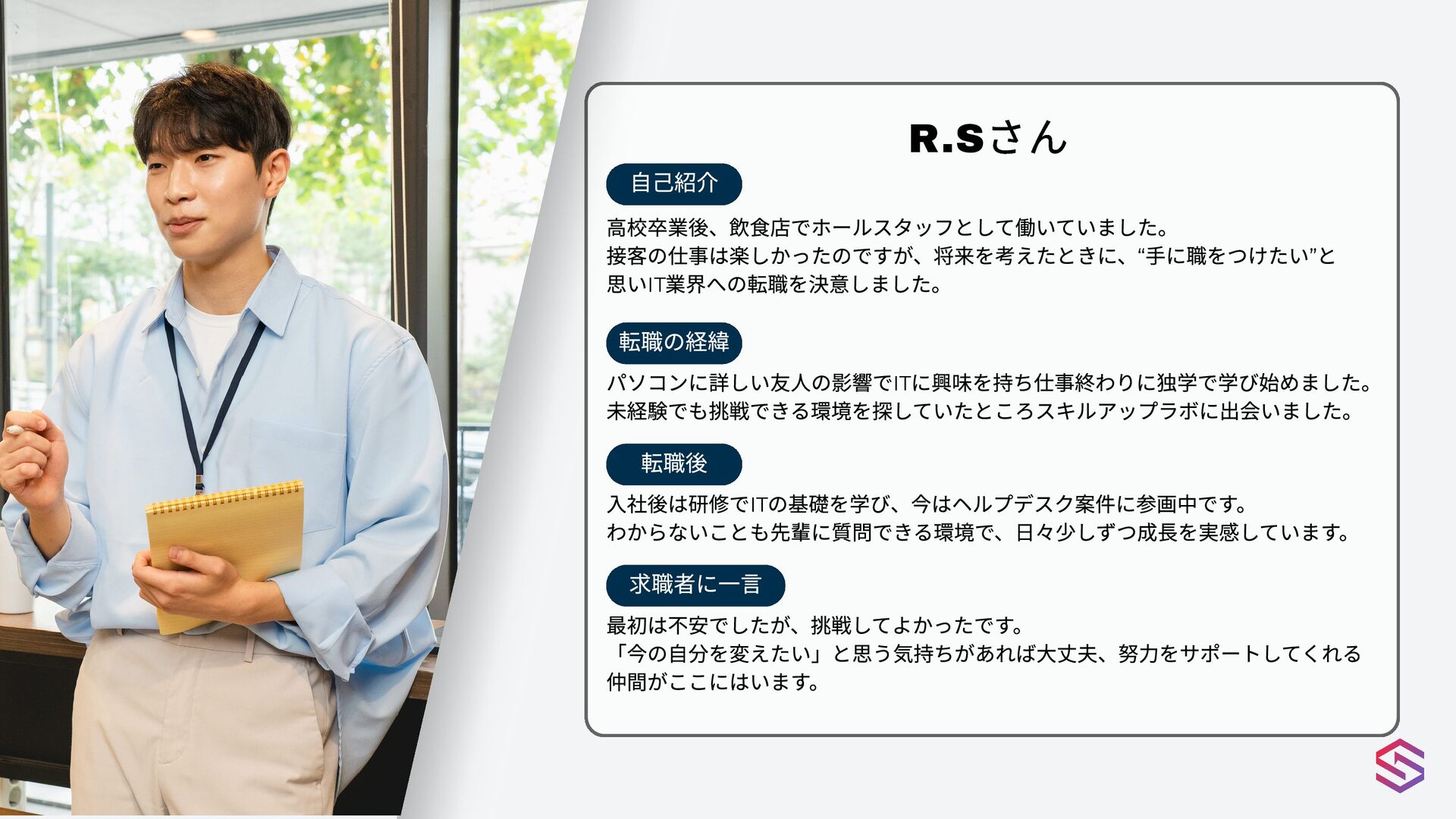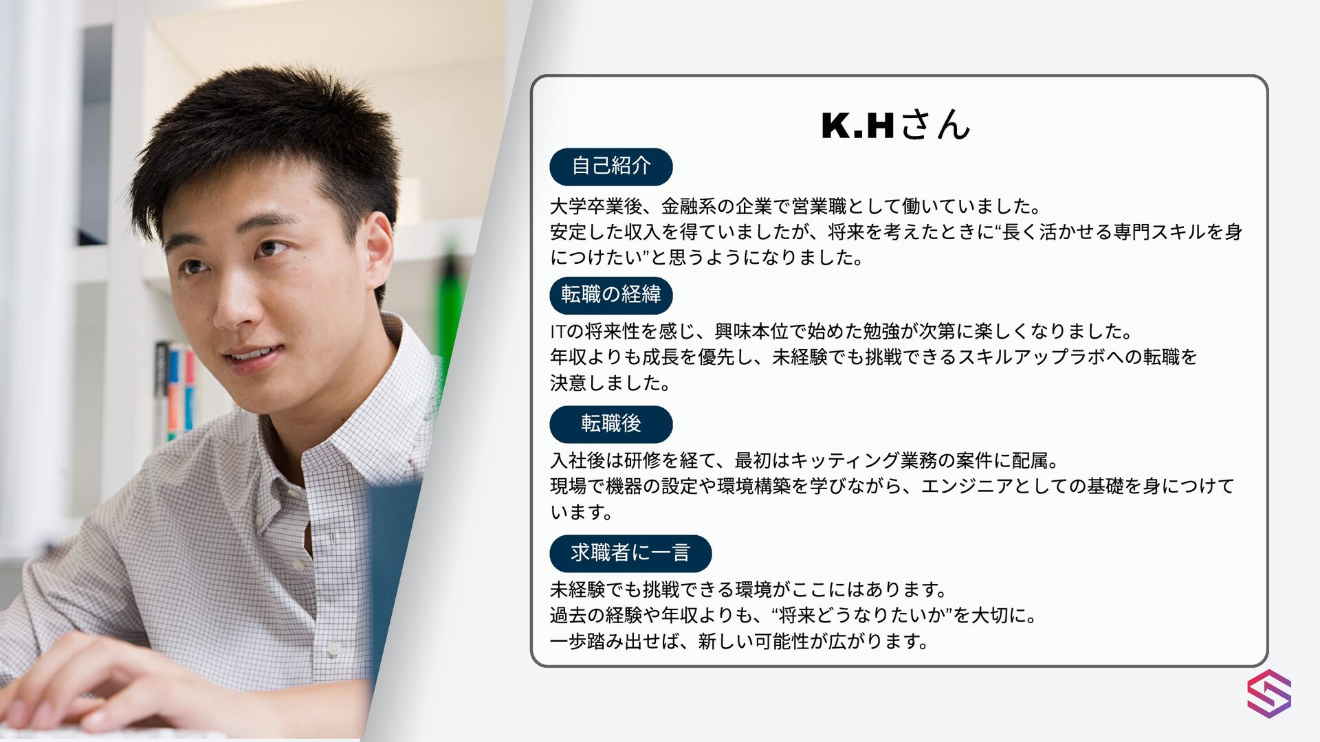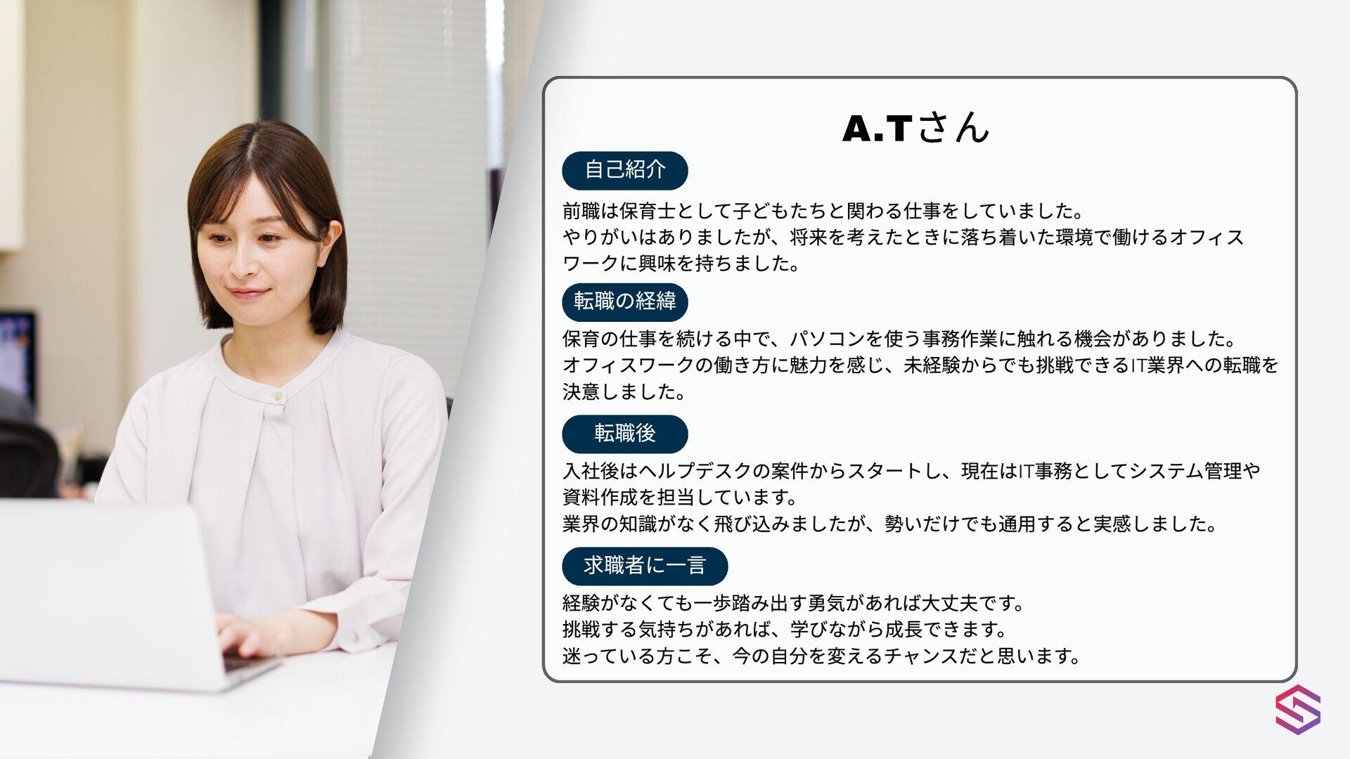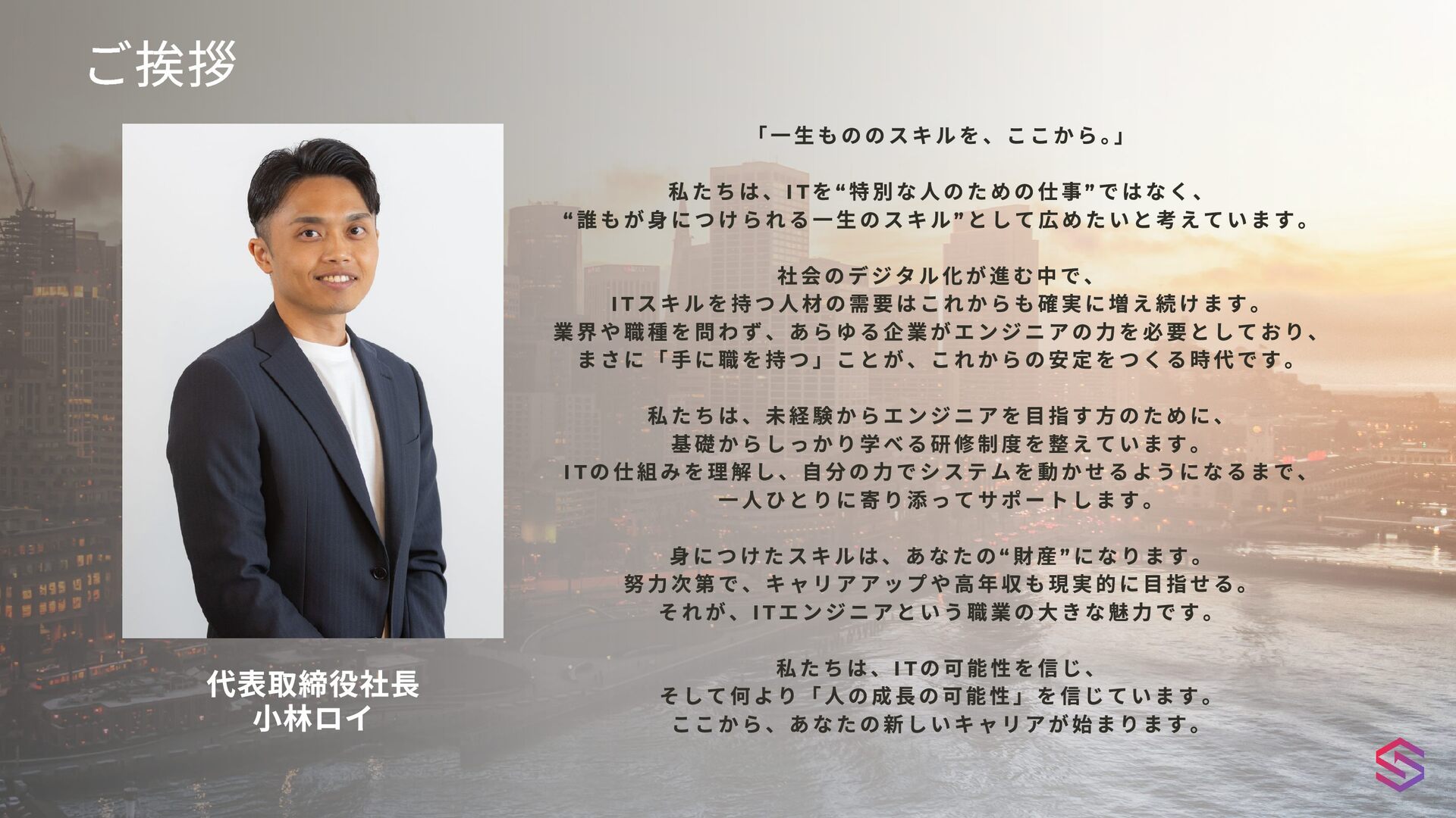 ス の O J T や 定 期 的 な 技 術 研 修 、資格 取得 支 援 に よ り 現 場 で 価 値 を 発 揮 で きるエ ン ジニ ア を 育 成 。 エ ン ジ ニ ア の コ ミ ュニティも完備。 キャリア支援 『どうなりたいか』から逆算するキャリア設計へ 定期面談やカウンセリングを通じて、一人ひとりの目標に沿った案件 提案やスキル支援を実施。資格取得やキャリアアップの相談も行い、 長期的に成長できる環境を整備。 福利厚生 『働くを支える』制度も充実 社会保険・有休・産休・育休などSES 企業でも一般企業と変わらぬ 安心感。 ラ イ フ イ ベ ン ト で も サ ポ ー ト し 、 プ ラ イ ベートも充実。 営業力 『営業が強い会社』はエンジニアが伸びる エ ン ジ ニ ア 経 験 を 有 す る ト ッ プ セ ー ル ス 出身者が多数在籍し 常時1 2 0 件以上の新規案件 を 開 拓 。 東 京 に 営 業 部 隊 も 保 有し て お り 、 最 先 端 の 案件 を リ モ ー ト 勤 務 で 参 画することも可能。