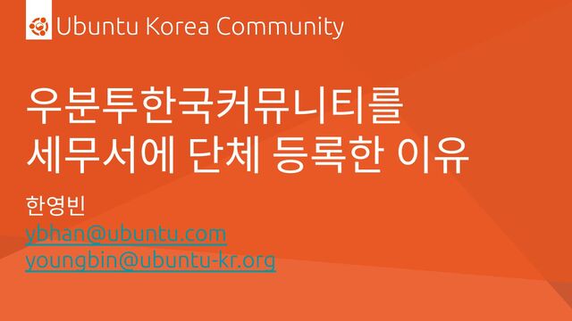 ? 2. “ ” 굳이 법인으로 보는 단체 등록만 하고 , 다른 선택지 ( 비영리민간단체 등록 , 비영리법인 등기나 회사 설립 등 ) 는 고려하지 않은 이유 3. 고유번호증 발급 , 계좌 개설부터 수익사업개시신고와 금융거래한도 해제까지 4. 세무 / 회계 / 각종 행정처리에 관한 고민 - 모범 사례까지는 아니지만 , 우분투한국커뮤니티에서는 어떻게 하고 있는가 . 5. 고유번호증이 있는 비법인사단도 생각보다 많은 것을 할 수 있다 ! 6. “ ” 우리 커뮤니티도 법인으로 보는 단체 로 등록 하거나 비영리법인 설립 / 등기를 고려 해야 할까 ?