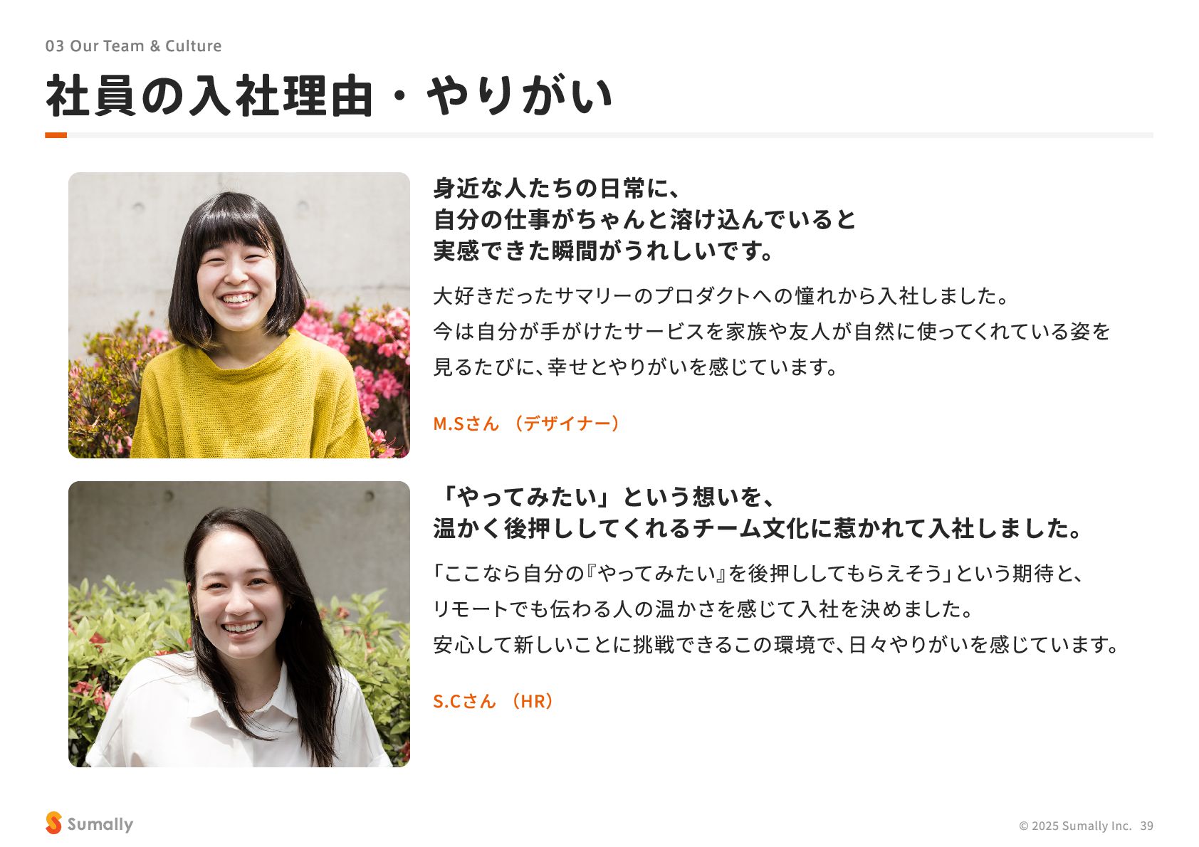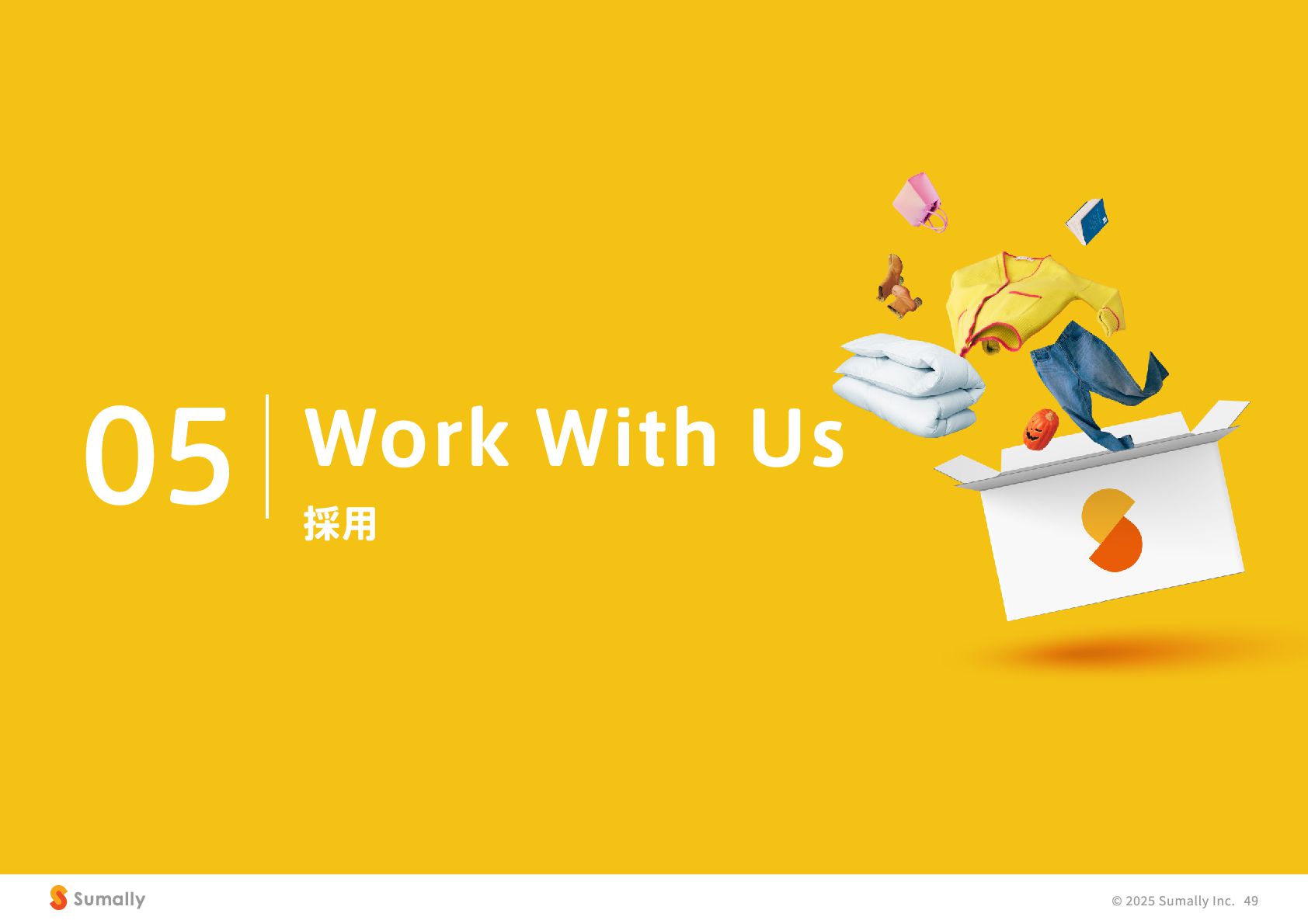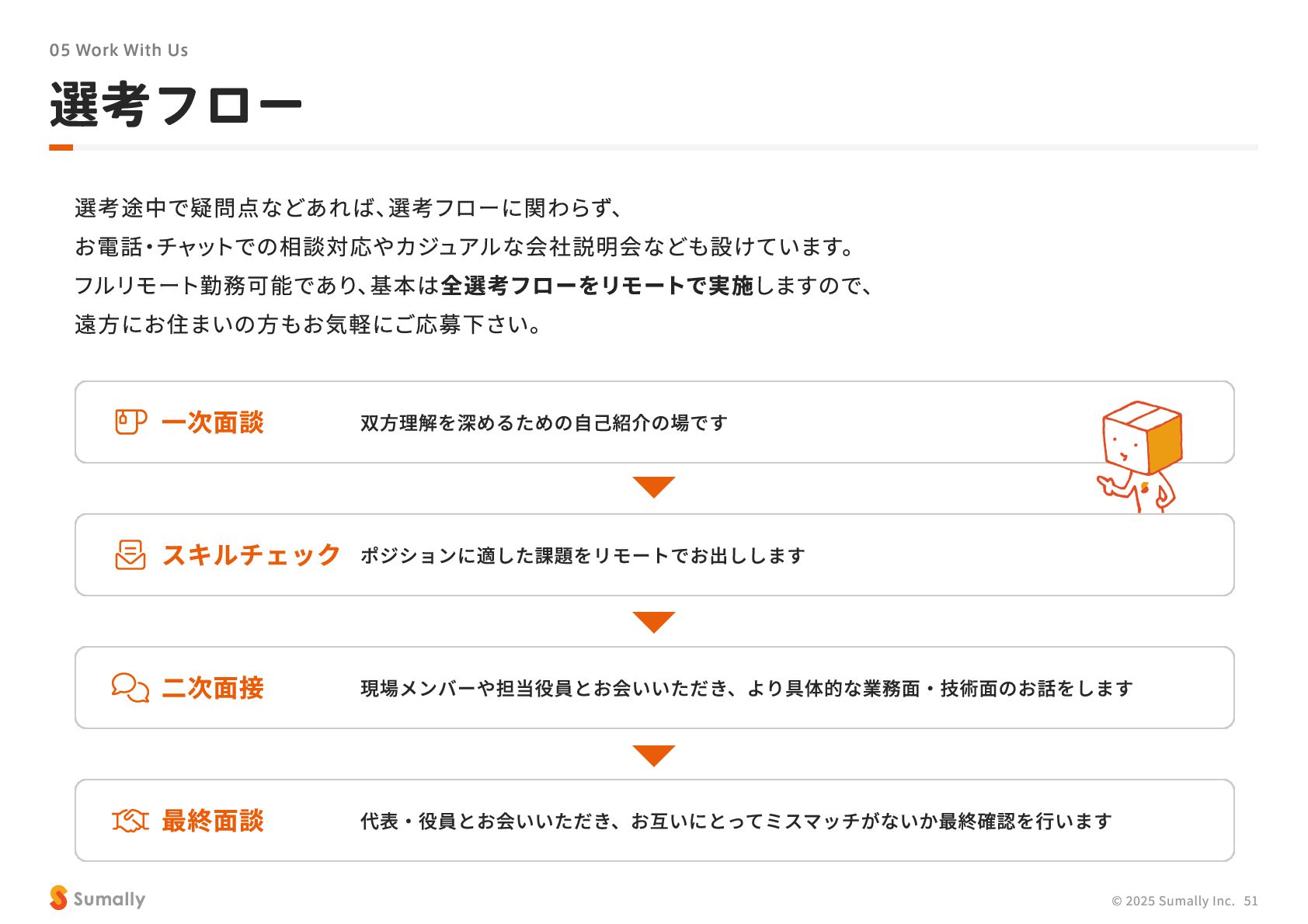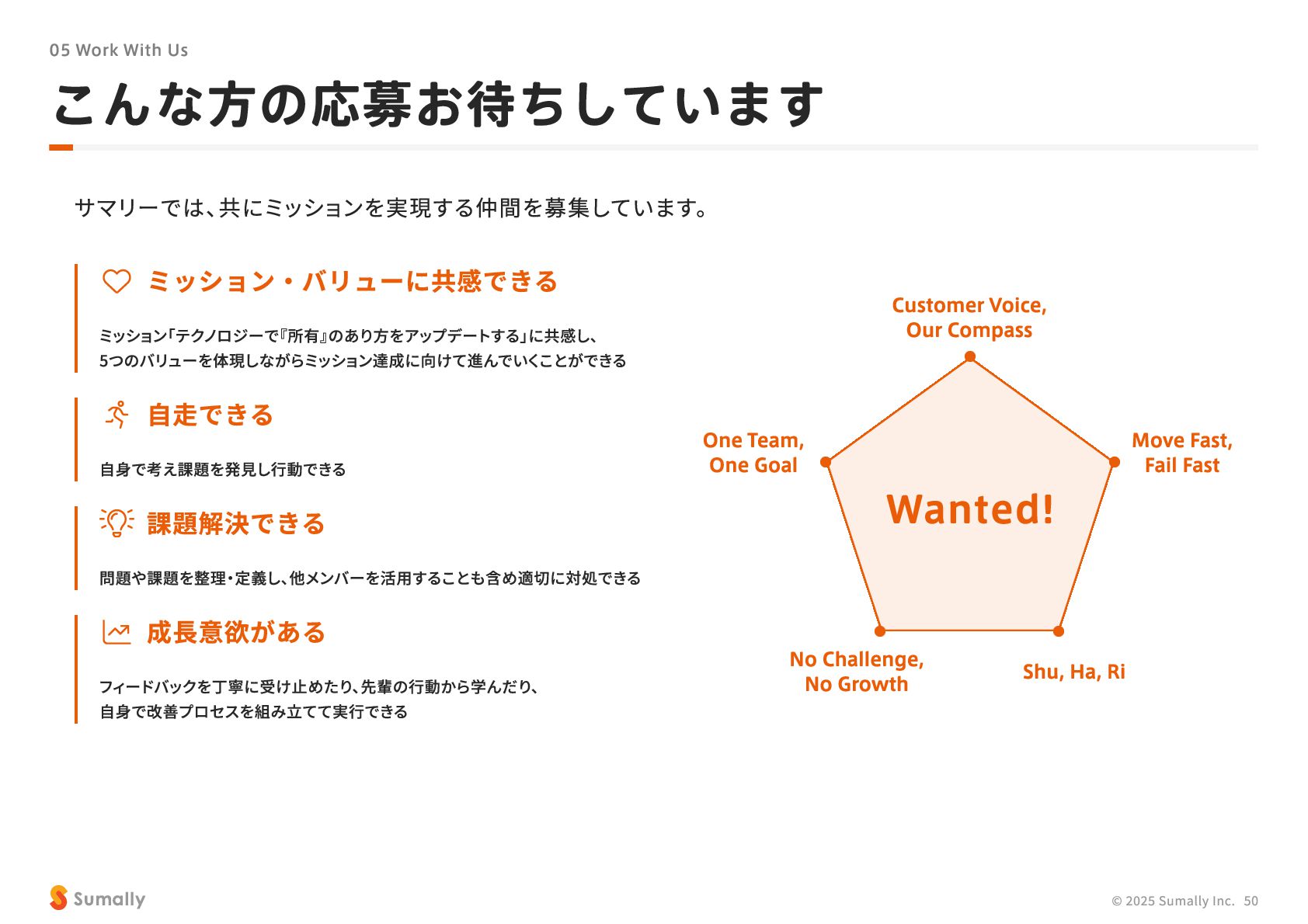 『所有』 のあり方をアップデートする」 に共感し、 5つのバリューを体現しながらミッション達成に向けて進んでいく ことができる 自走できる 自身で考え課題を発見し行動できる 課題解決できる 問題や課題を整理 ・ 定義し、 他メンバーを活用することも含め適切に対処できる 成長意欲がある フィードバックを丁寧に受け止めたり、 先輩の行動から学んだり、 自身で改善プロセスを組み立てて実行できる Customer Voice, Our Compass Move Fast, Fail Fast One Team, One Goal No Challenge, No Growth Shu, Ha, Ri Wanted! © 2025 Sumally Inc. 50