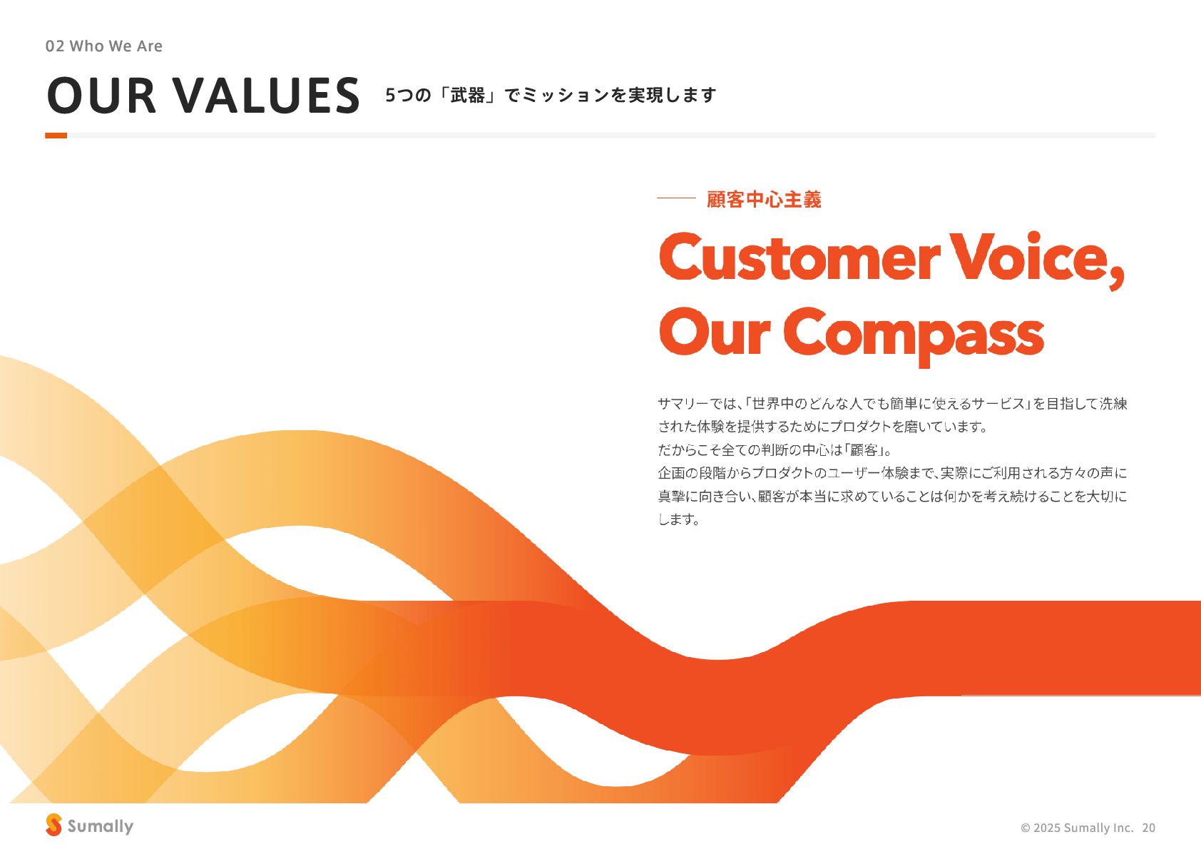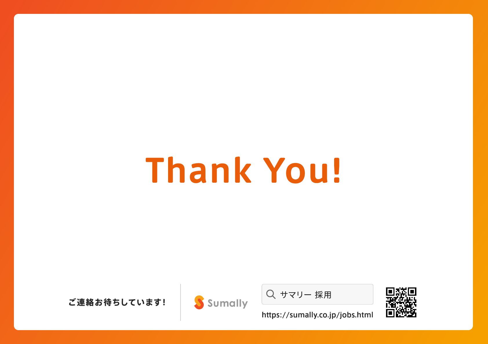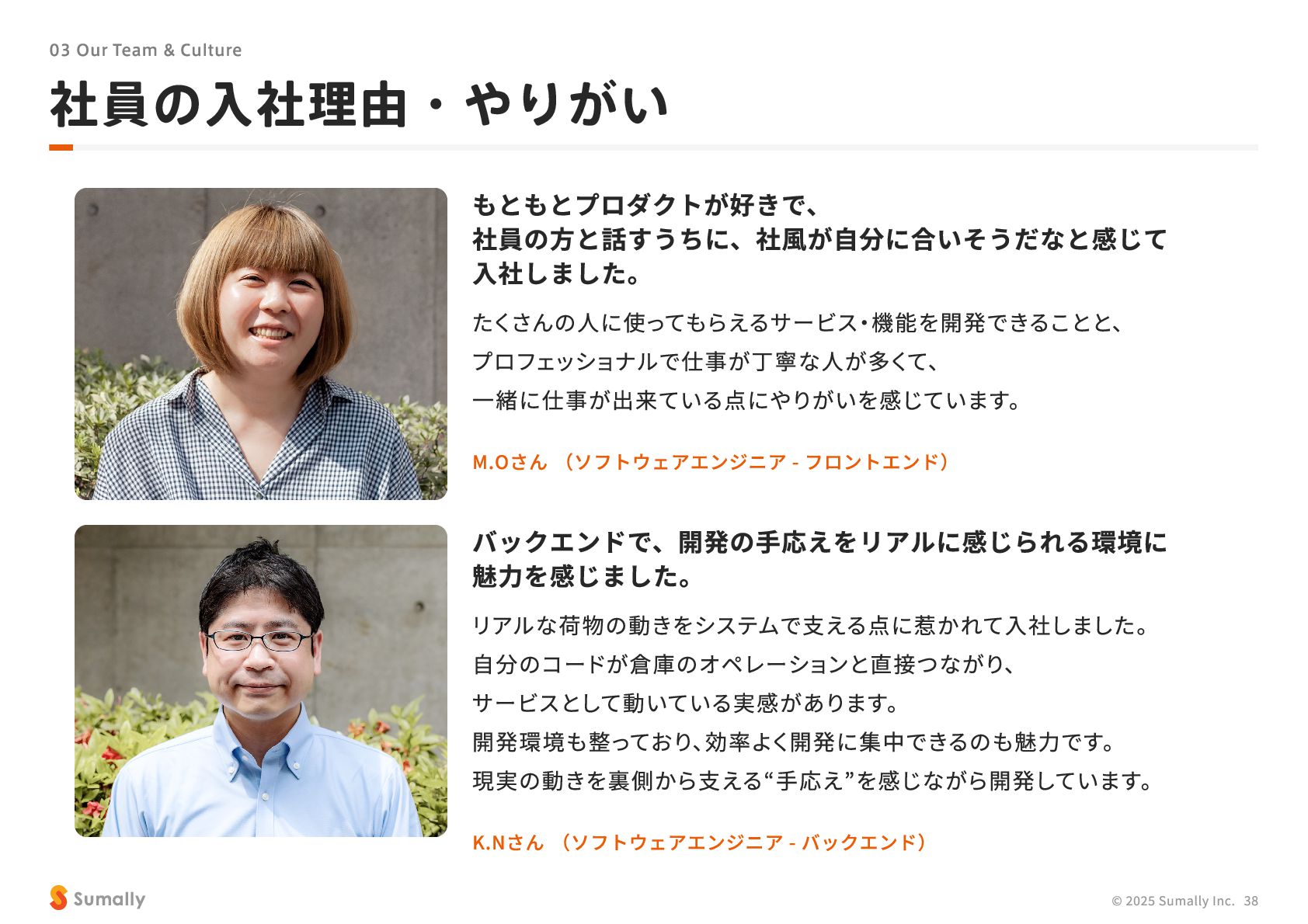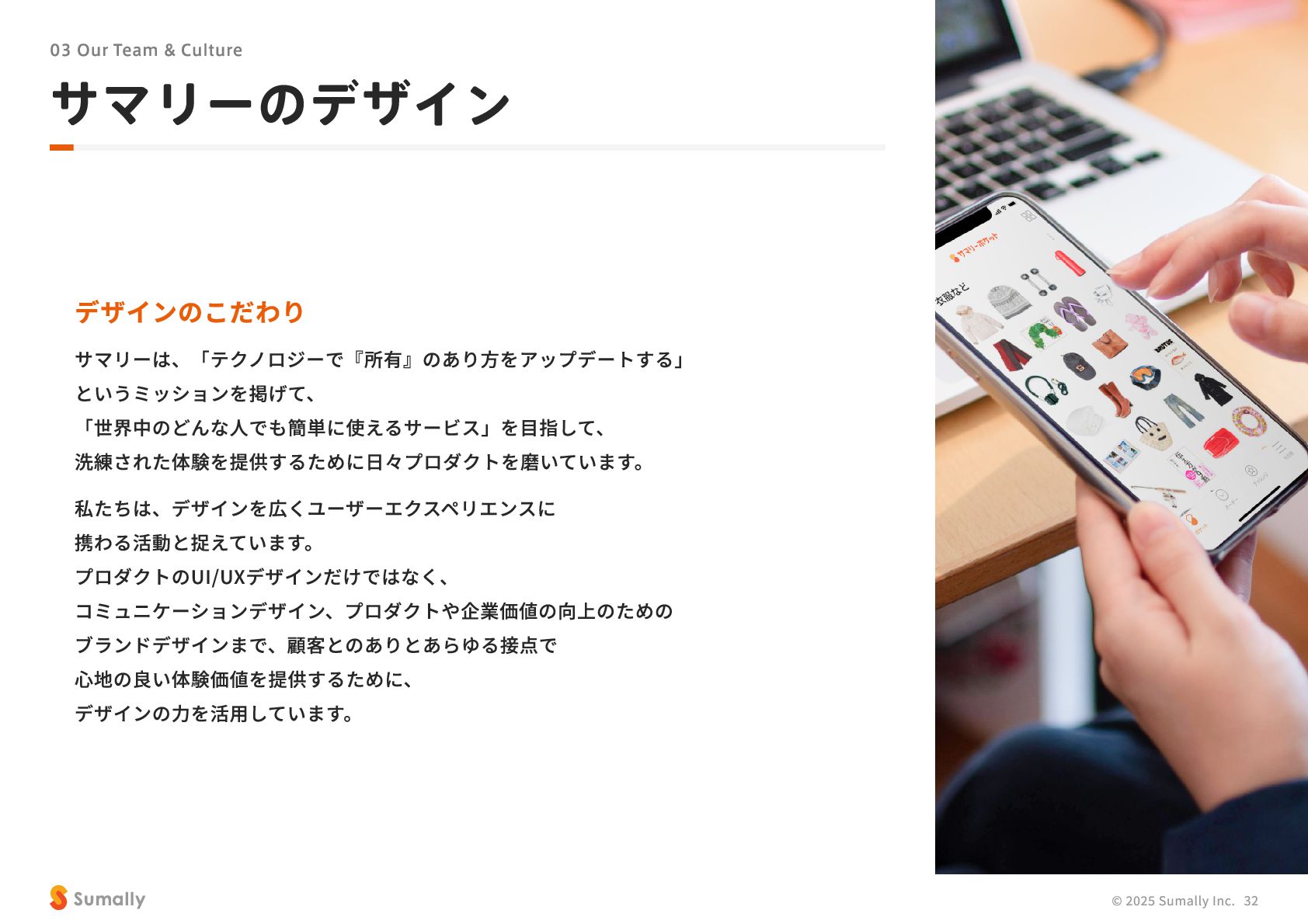 『所有』 のあり方をアップデートする」 に共感し、 5つのバリューを体現しながらミッション達成に向けて進んでいく ことができる 自走できる 自身で考え課題を発見し行動できる 課題解決できる 問題や課題を整理 ・ 定義し、 他メンバーを活用することも含め適切に対処できる 成長意欲がある フィードバックを丁寧に受け止めたり、 先輩の行動から学んだり、 自身で改善プロセスを組み立てて実行できる Customer Voice, Our Compass Move Fast, Fail Fast One Team, One Goal No Challenge, No Growth Shu, Ha, Ri Wanted! © 2025 Sumally Inc. 50