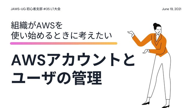 account policy.You need to consider the best policy for your company while considering the advantages and disadvantages from multiple angles.AWS has many features to help you manage your accounts. Consider using accounts for billing management and security, and streamlining operations management. アカウントの 理には AWS Organizations を利⽤しよう AWS SSO はいいぞ にベストな を しよう 1 2 3