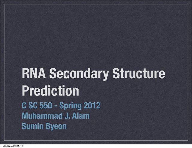 The hydrogen bond at a base pair tries to stabilize the structure Free bases inside a loop tries to disrupt the structure Difference between these two is the destabilizing energy Given a primary structure of an RNA, find the secondary structure with least total energy Tuesday, April 24, 12