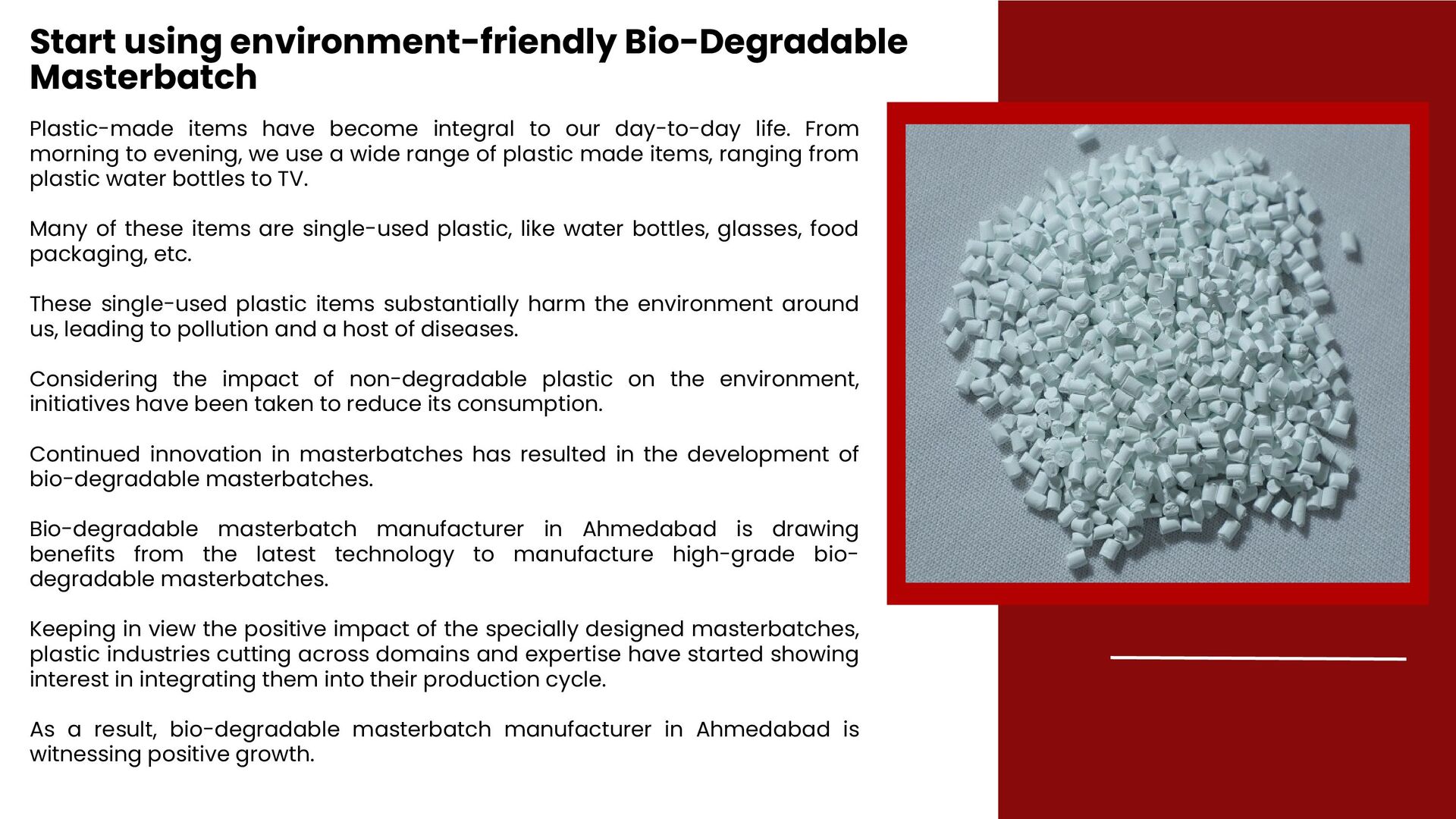 Considering the impact of non-degradable plastic on the environment, initiatives have been taken to reduce its consumption. Continued innovation in masterbatches has resulted in the development of bio-degradable masterbatches. Bio-degradable masterbatch manufacturer in Ahmedabad is drawing benefits from the latest technology to manufacture high-grade bio-degradable masterbatches.