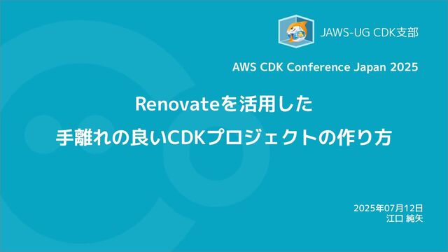 Renovateを活用した 手離れの良いCDKプロジェクトの作り方 2025年07月12日 江口 純矢 JAWS-UG CDK支部 AWS CDK Conference