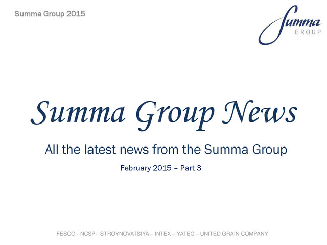 port logistics, engineering, construction, oil and gas sectors as well as telecommunications. Summa Group is a diversified private holding that comprises of more then 10 000 people in 40 regions of Russia and abroad. Mr Ziyavudin Magomedov is the founder and shareholder of the Summa Group, which celebrated its 10 year anniversary in 2014. Summa Group 2015 – Feb – PT3 FESCO - NCSP- STROYNOVATSIYA – INTEX – YATEC – UNITED GRAIN COMPANY