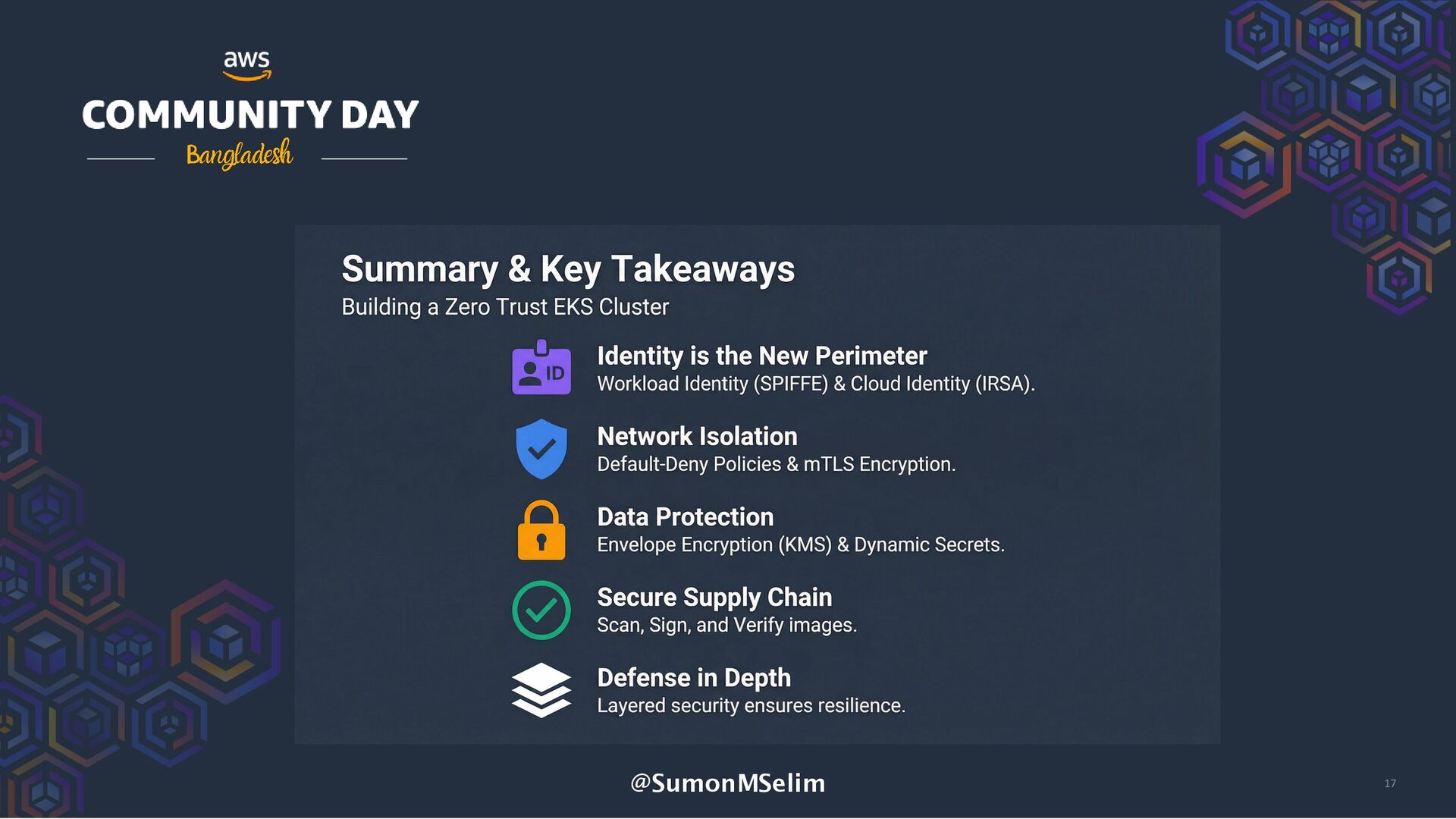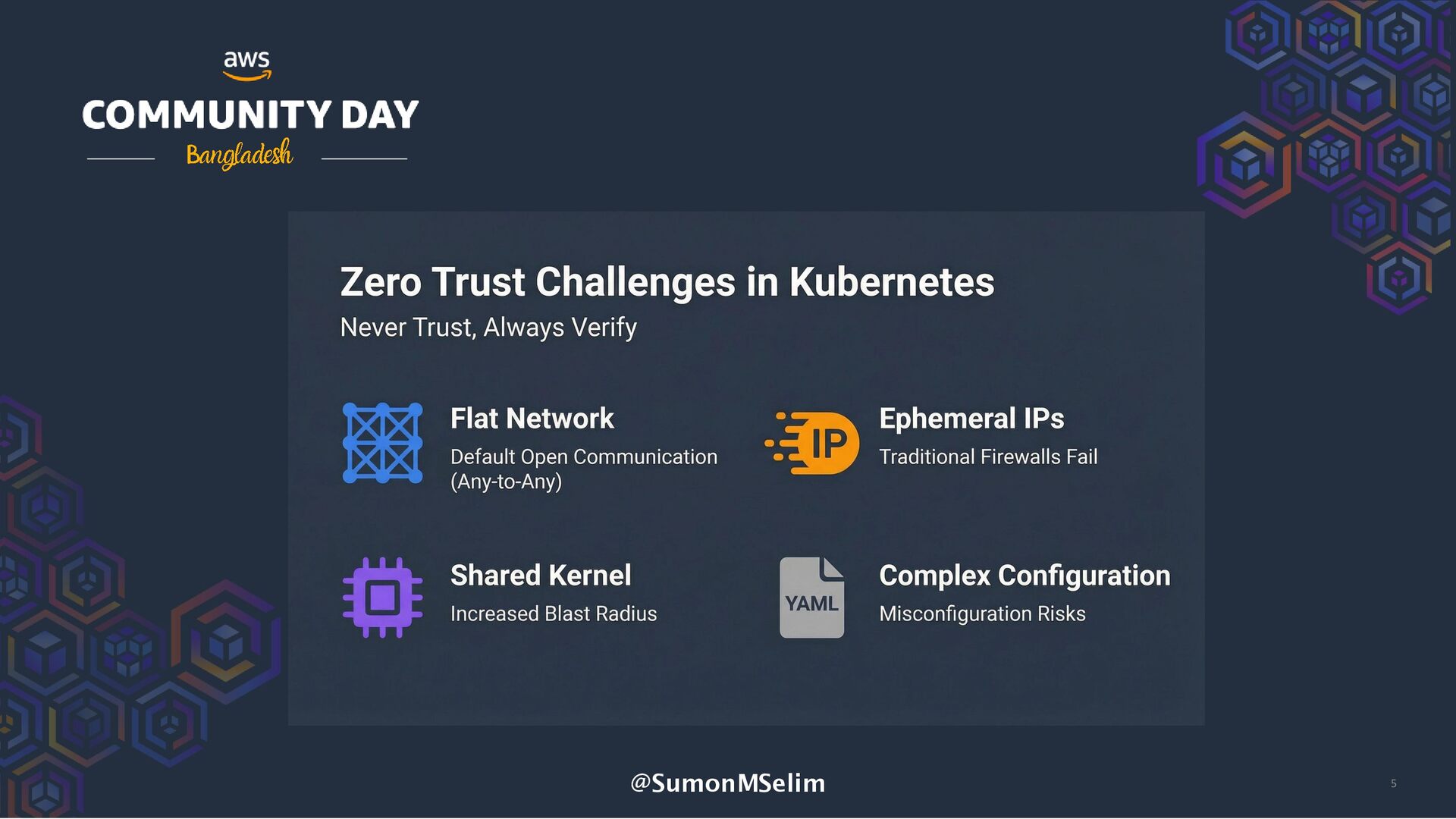 As cloud-native architectures scale, the traditional network perimeter no longer exists. Kubernetes clusters on AWS — whether single or multi-tenant — demand a new approach to security: Zero Trust. In this session, we’ll explore how to build a Zero Trust architecture inside Amazon EKS, focusing on workload identity, authentication, authorization, and encryption across services.