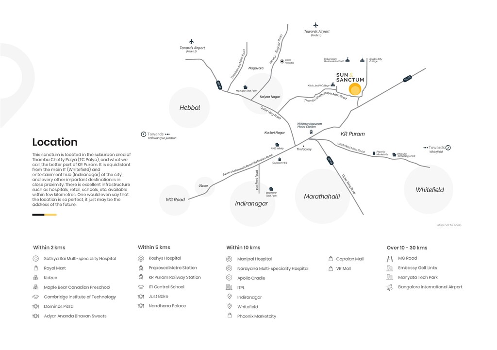 Sun & Sanctum is Perfectly located in KR Puram, Very close to All Major Workplaces, Schools, Colleges, Hospitals & Malls. Just 40 Mins drive from Bangalore International Airport!