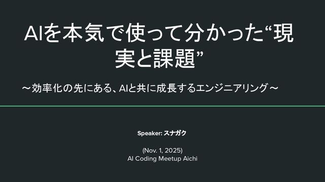 AIを本気で使って分かった“現 実と課題” Speaker: スナガク 〜効率化の先にある、AIと共に成長するエンジニアリング〜 (Nov. 1, 2025) AI Coding