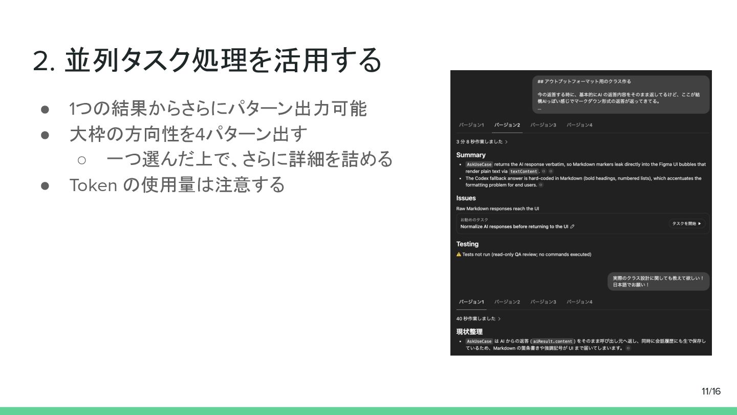 2. 並列タスク処理を活用する • 1つの結果からさらにパターン出力可能 • 大枠の方向性を4パターン出す ◦ 一つ選んだ上で、さらに詳細を詰める • Token