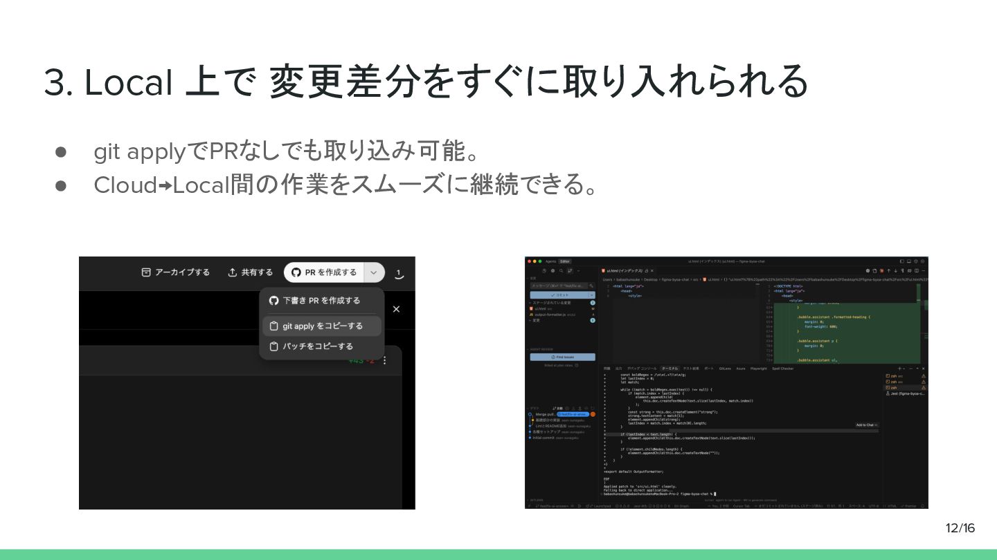 3. Local 上で 変更差分をすぐに取り入れられる • git applyでPRなしでも取り込み可能。 • Cloud→Local間の作業をスムーズに継続できる。 12/16