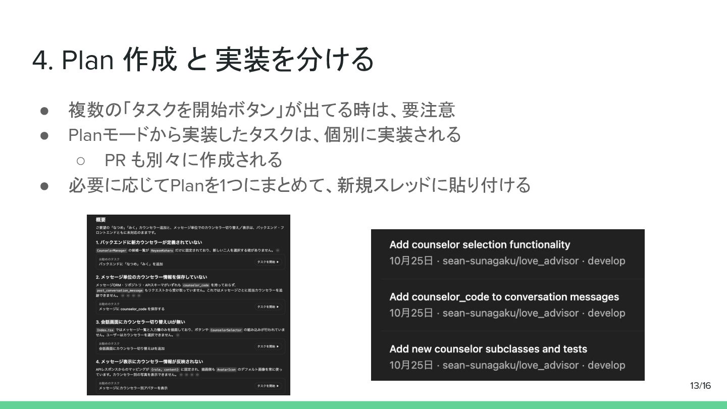 4. Plan 作成 と 実装を分ける • 複数の「タスクを開始ボタン」が出てる時は、要注意 • Planモードから実装したタスクは、個別に実装される ◦