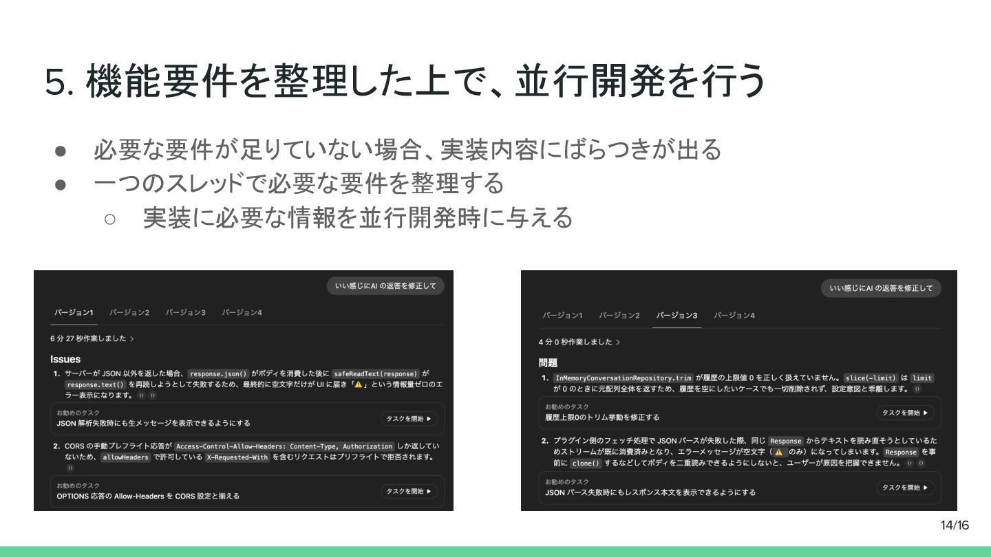 5. 機能要件を整理した上で、並行開発を行う • 必要な要件が足りていない場合、実装内容にばらつきが出る • 一つのスレッドで必要な要件を整理する ◦ 実装に必要な情報を並行開発時に与える 14/16