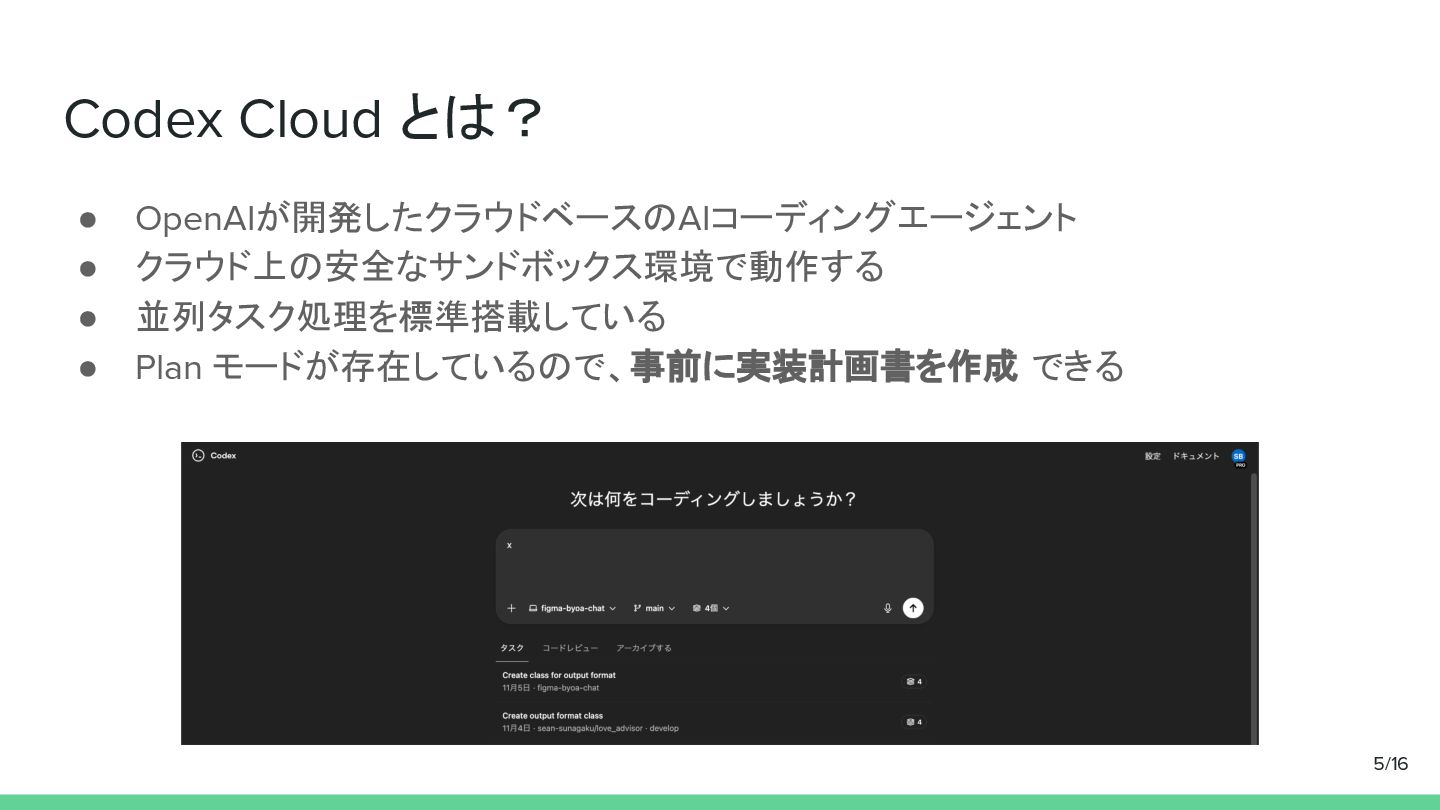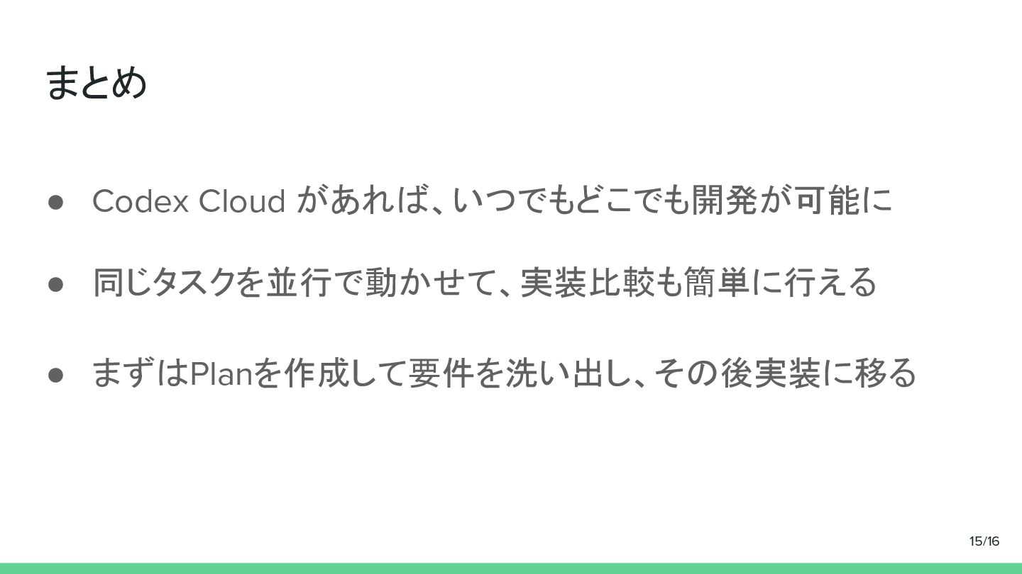 まとめ • Codex Cloud があれば、いつでもどこでも開発が可能に • 同じタスクを並行で動かせて、実装比較も簡単に行える • まずはPlanを作成して要件を洗い出し、その後実装に移る 15/16