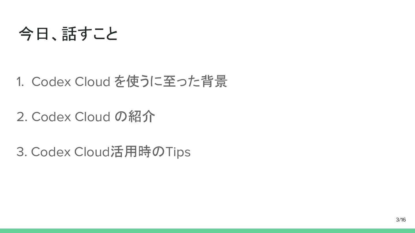 今日、話すこと 1. Codex Cloud を使うに至った背景 2. Codex Cloud の紹介 3.