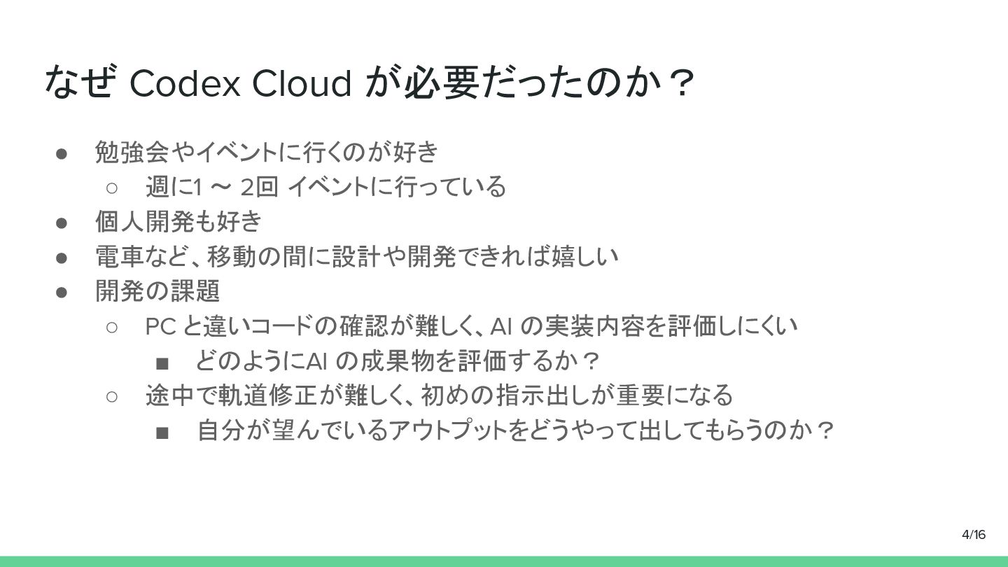 なぜ Codex Cloud が必要だったのか? • 勉強会やイベントに行くのが好き ◦ 週に1 〜 2回