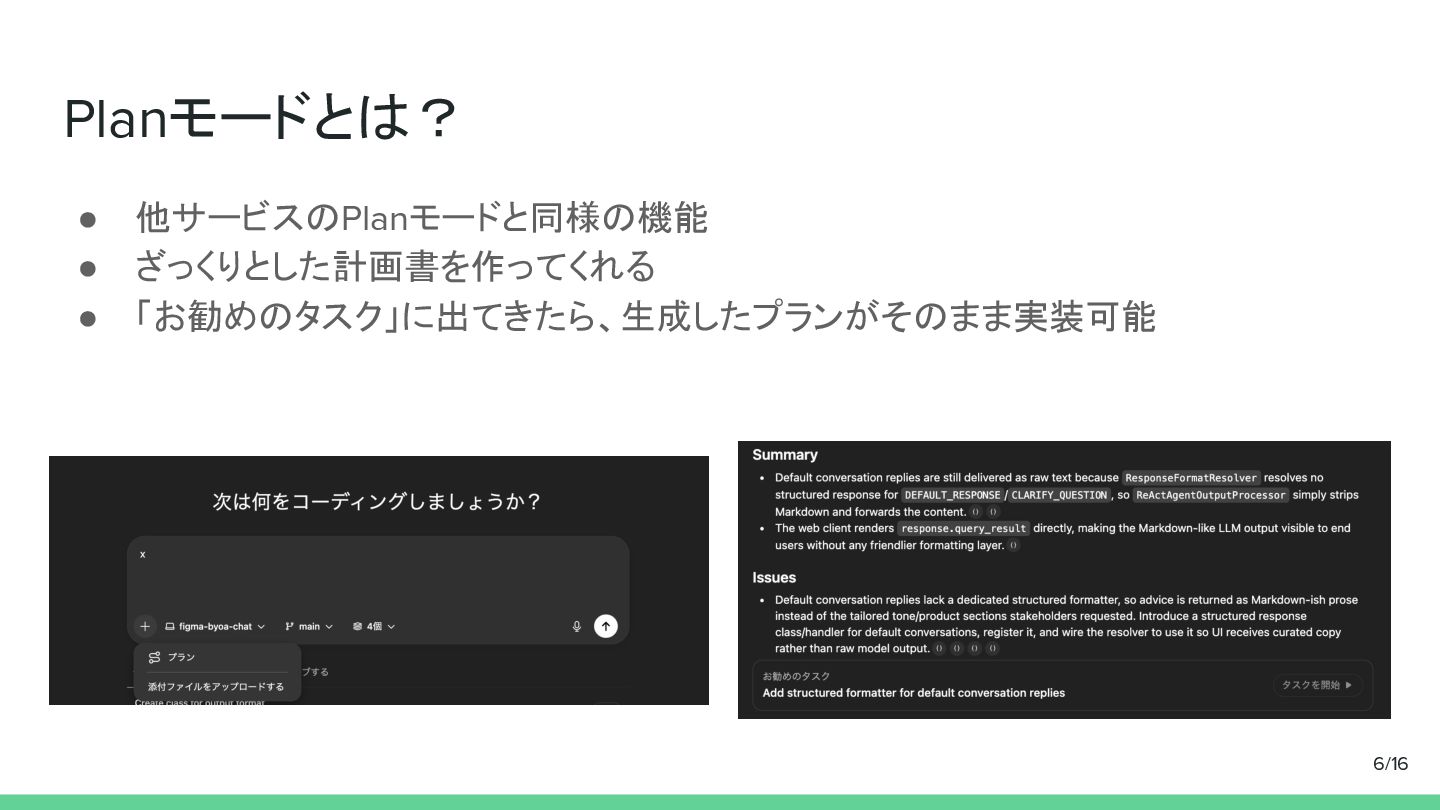 Planモードとは? • 他サービスのPlanモードと同様の機能 • ざっくりとした計画書を作ってくれる • 「お勧めのタスク」に出てきたら、生成したプランがそのまま実装可能 6/16