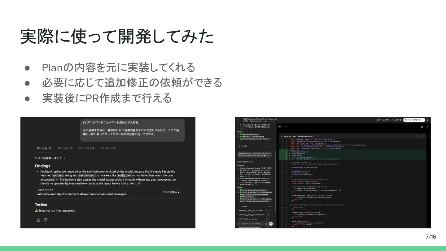 実際に使って開発してみた • Planの内容を元に実装してくれる • 必要に応じて追加修正の依頼ができる • 実装後にPR作成まで行える 7/16