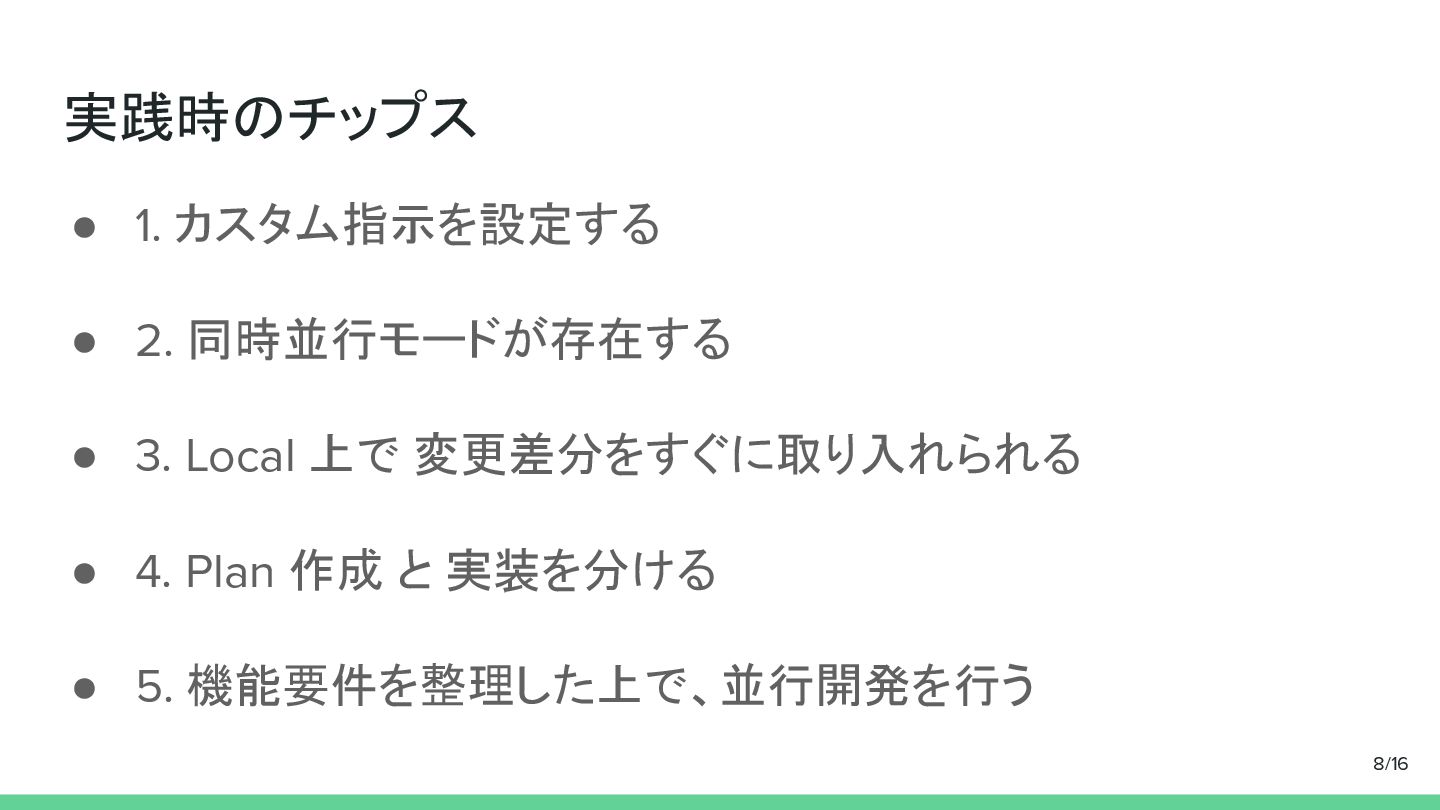 上で 変更差分をすぐに取り入れられる • 4. Plan 作成 と 実装を分ける • 5. 機能要件を整理した上で、並行開発を行う 8/16