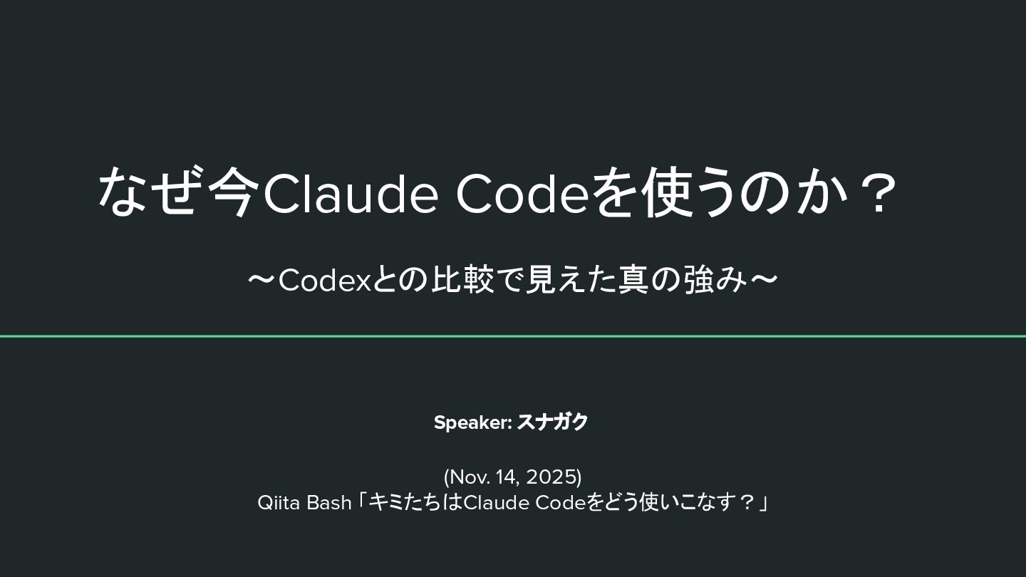 なぜ今Claude Codeを使うのか? Speaker: スナガク 〜Codexとの比較で見えた真の強み〜 (Nov. 14, 2025) Qiita Bash