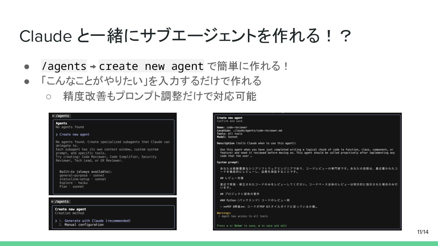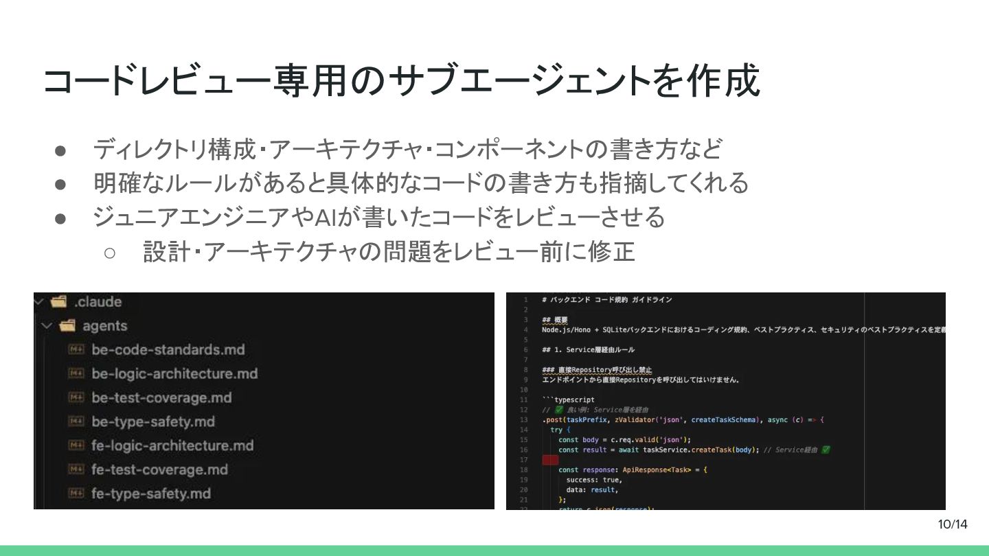 コードレビュー専用のサブエージェントを作成 • ディレクトリ構成・アーキテクチャ・コンポーネントの書き方など • 明確なルールがあると具体的なコードの書き方も指摘してくれる • ジュニアエンジニアやAIが書いたコードをレビューさせる ◦ 設計・アーキテクチャの問題をレビュー前に修正 10/14