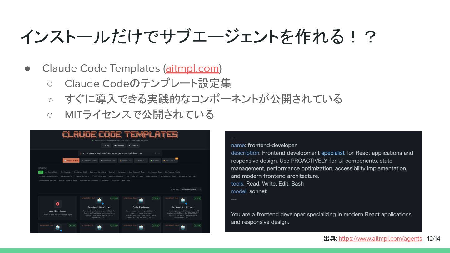 すぐに導入できる実践的なコンポーネントが公開されている ◦ MITライセンスで公開されている 12/14 出典: https://www.aitmpl.com/agents