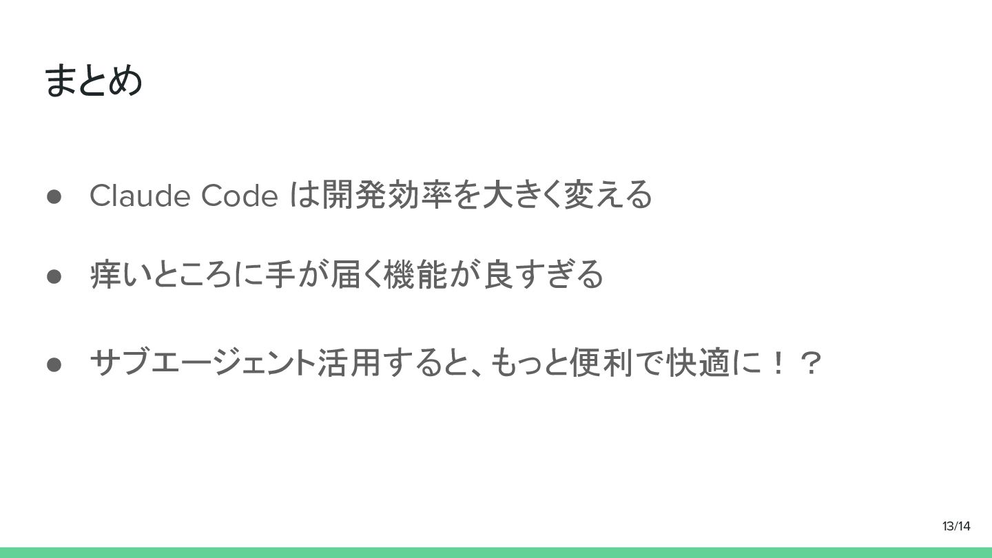 まとめ • Claude Code は開発効率を大きく変える • 痒いところに手が届く機能が良すぎる • サブエージェント活用すると、もっと便利で快適に!? 13/14