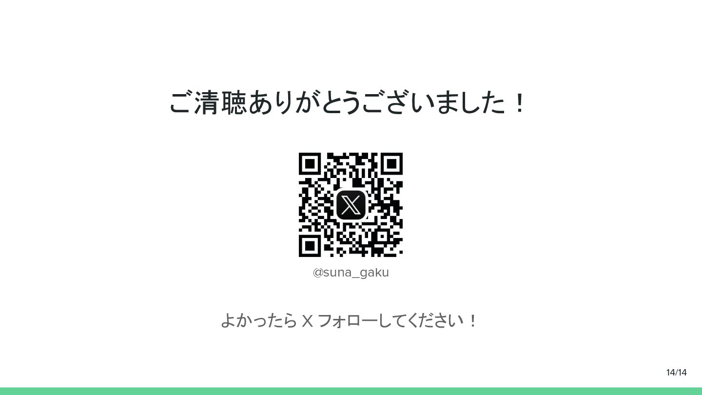 ご清聴ありがとうございました! よかったら X フォローしてください! @suna_gaku 14/14