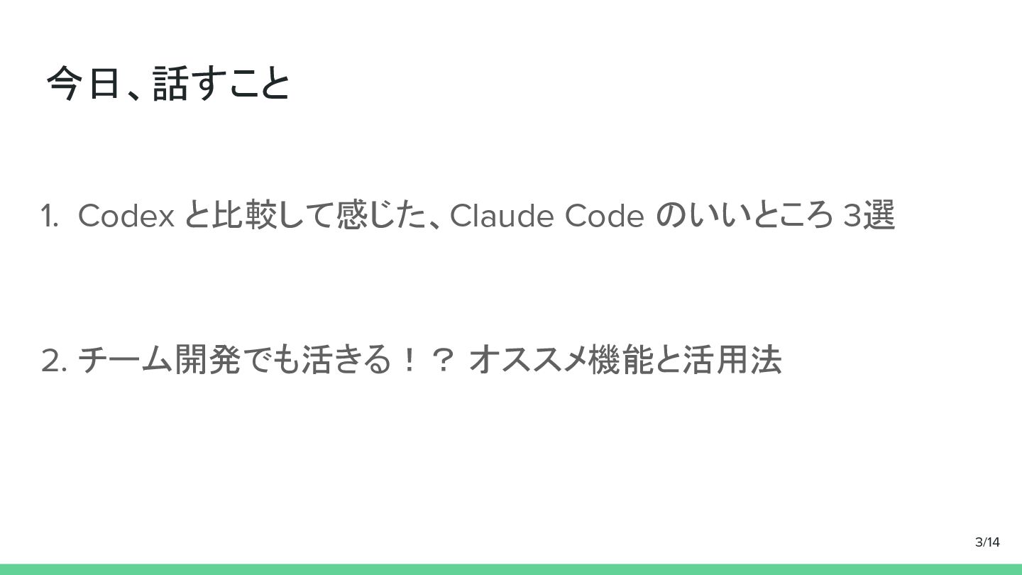 今日、話すこと 1. Codex と比較して感じた、Claude Code のいいところ 3選 2. チーム開発でも活きる!? オススメ機能と活用法