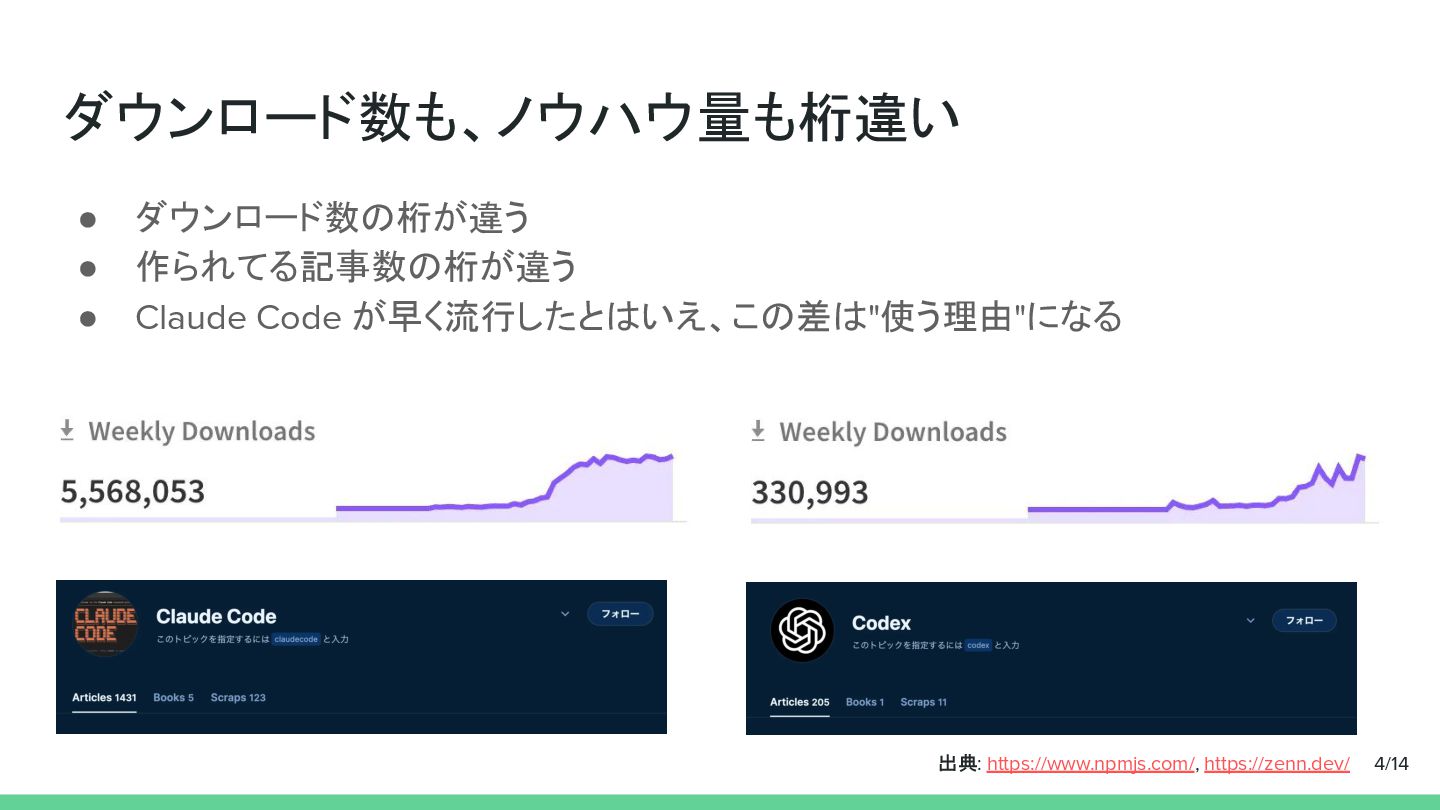 ダウンロード数も、ノウハウ量も桁違い • ダウンロード数の桁が違う • 作られてる記事数の桁が違う • Claude Code が早く流行したとはいえ、この差は"使う理由"になる 4/14