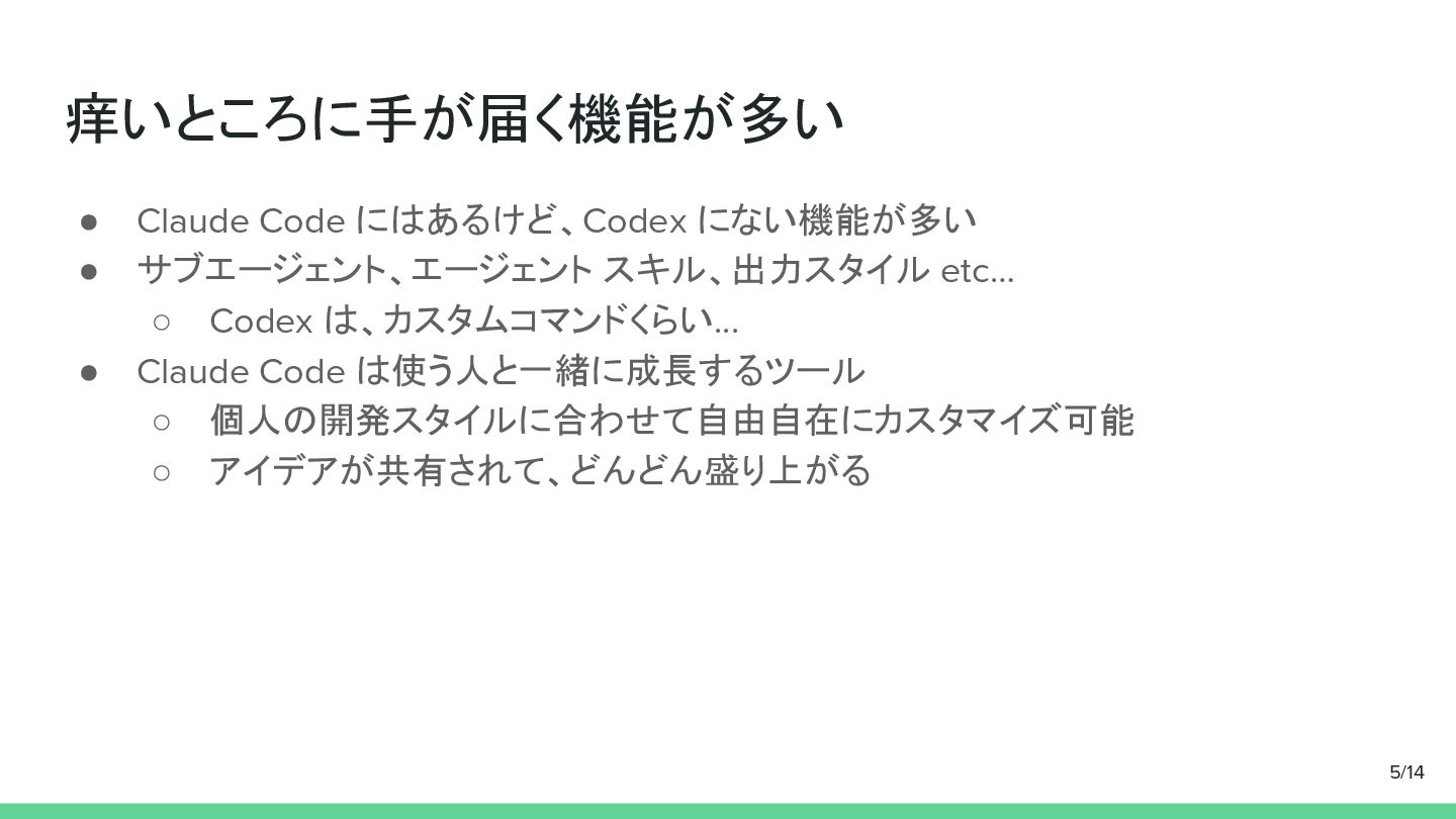 ◦ Codex は、カスタムコマンドくらい... • Claude Code は使う人と一緒に成長するツール ◦ 個人の開発スタイルに合わせて自由自在にカスタマイズ可能 ◦ アイデアが共有されて、どんどん盛り上がる 5/14