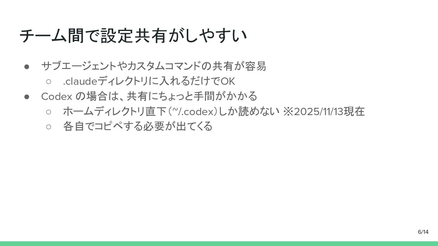 チーム間で設定共有がしやすい • サブエージェントやカスタムコマンドの共有が容易 ◦ .claudeディレクトリに入れるだけでOK • Codex の場合は、共有にちょっと手間がかかる ◦ ホームディレクトリ直下(~/.codex)しか読めない