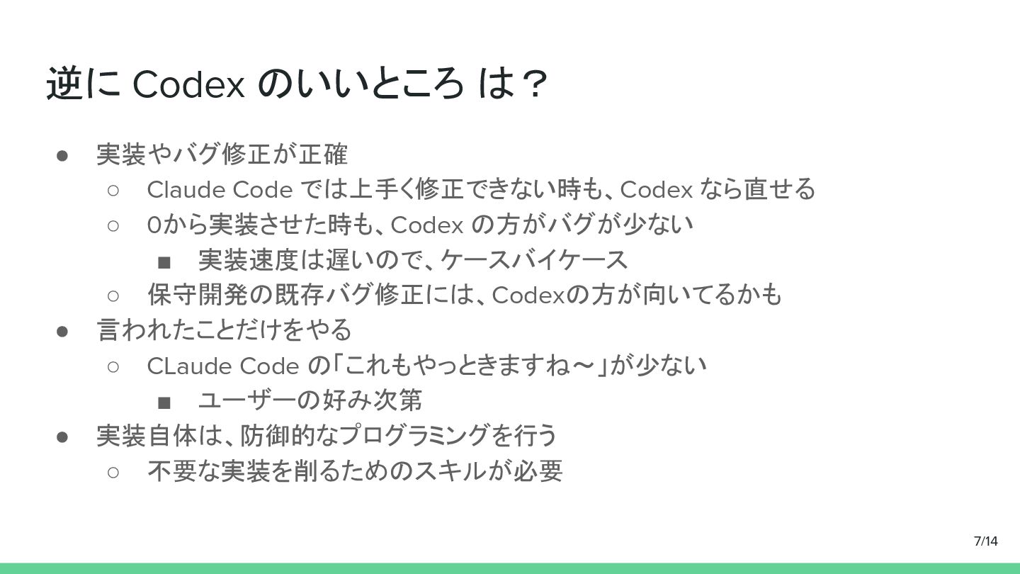 なら直せる ◦ 0から実装させた時も、Codex の方がバグが少ない ▪ 実装速度は遅いので、ケースバイケース ◦ 保守開発の既存バグ修正には、Codexの方が向いてるかも • 言われたことだけをやる ◦ CLaude Code の「これもやっときますね〜」が少ない ▪ ユーザーの好み次第 • 実装自体は、防御的なプログラミングを行う ◦ 不要な実装を削るためのスキルが必要 7/14