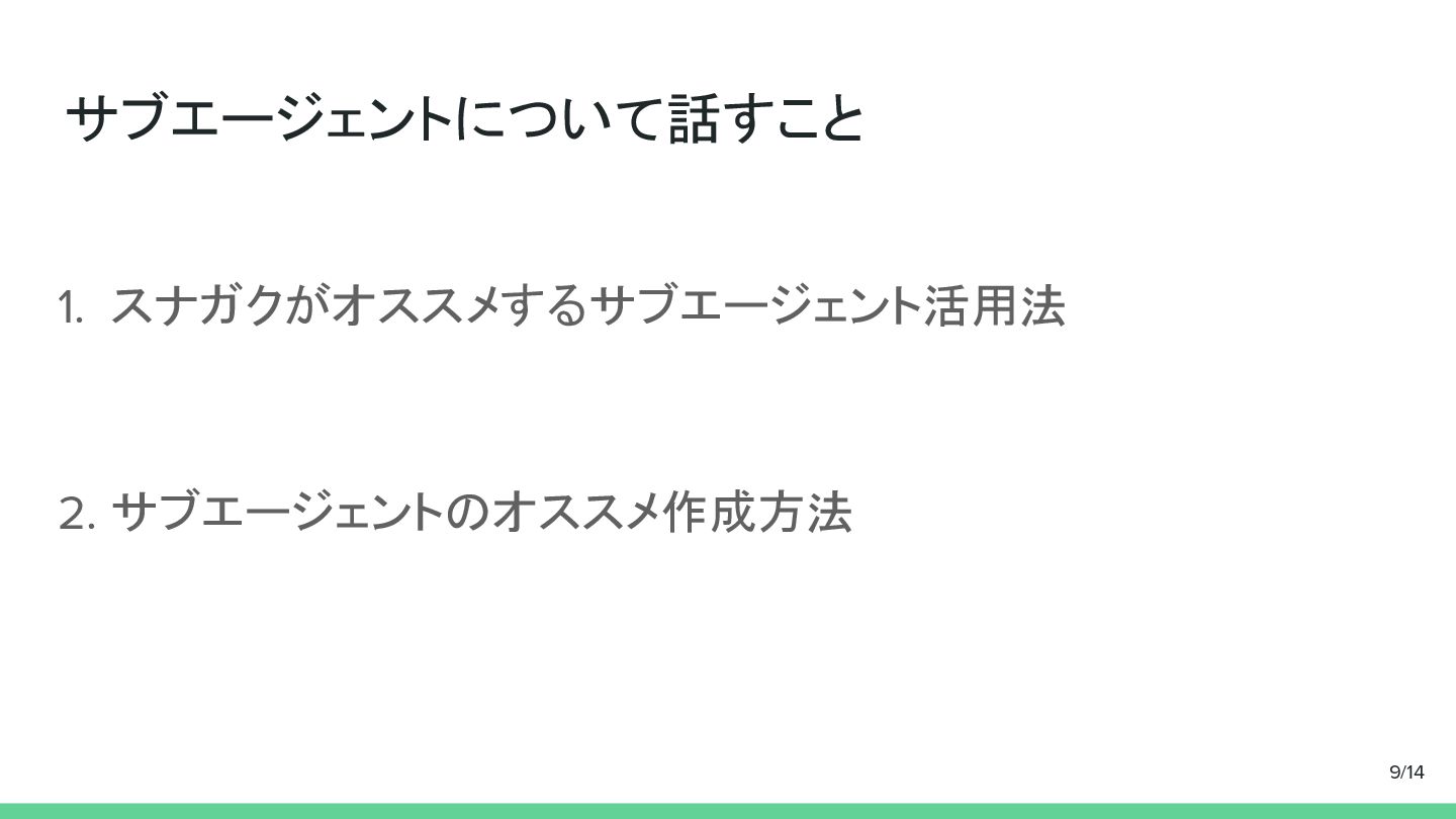 サブエージェントについて話すこと 1. スナガクがオススメするサブエージェント活用法 2. サブエージェントのオススメ作成方法 9/14