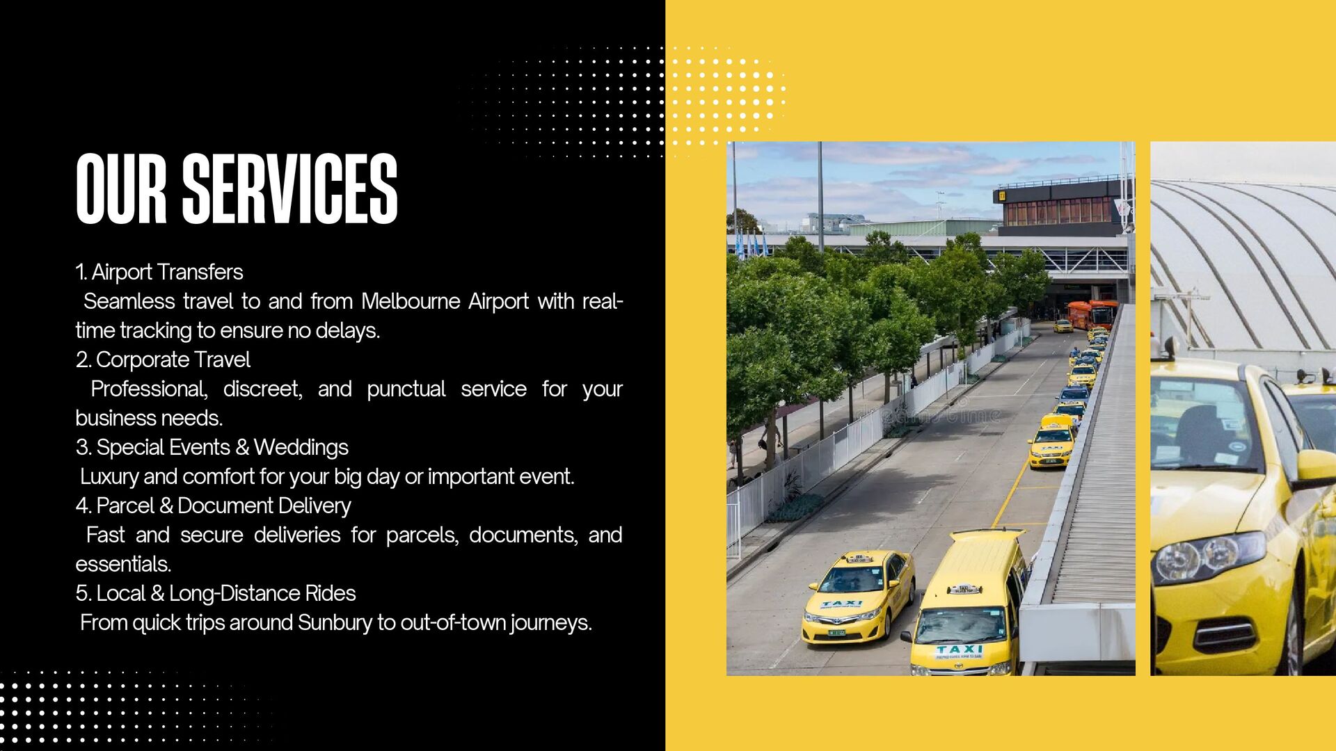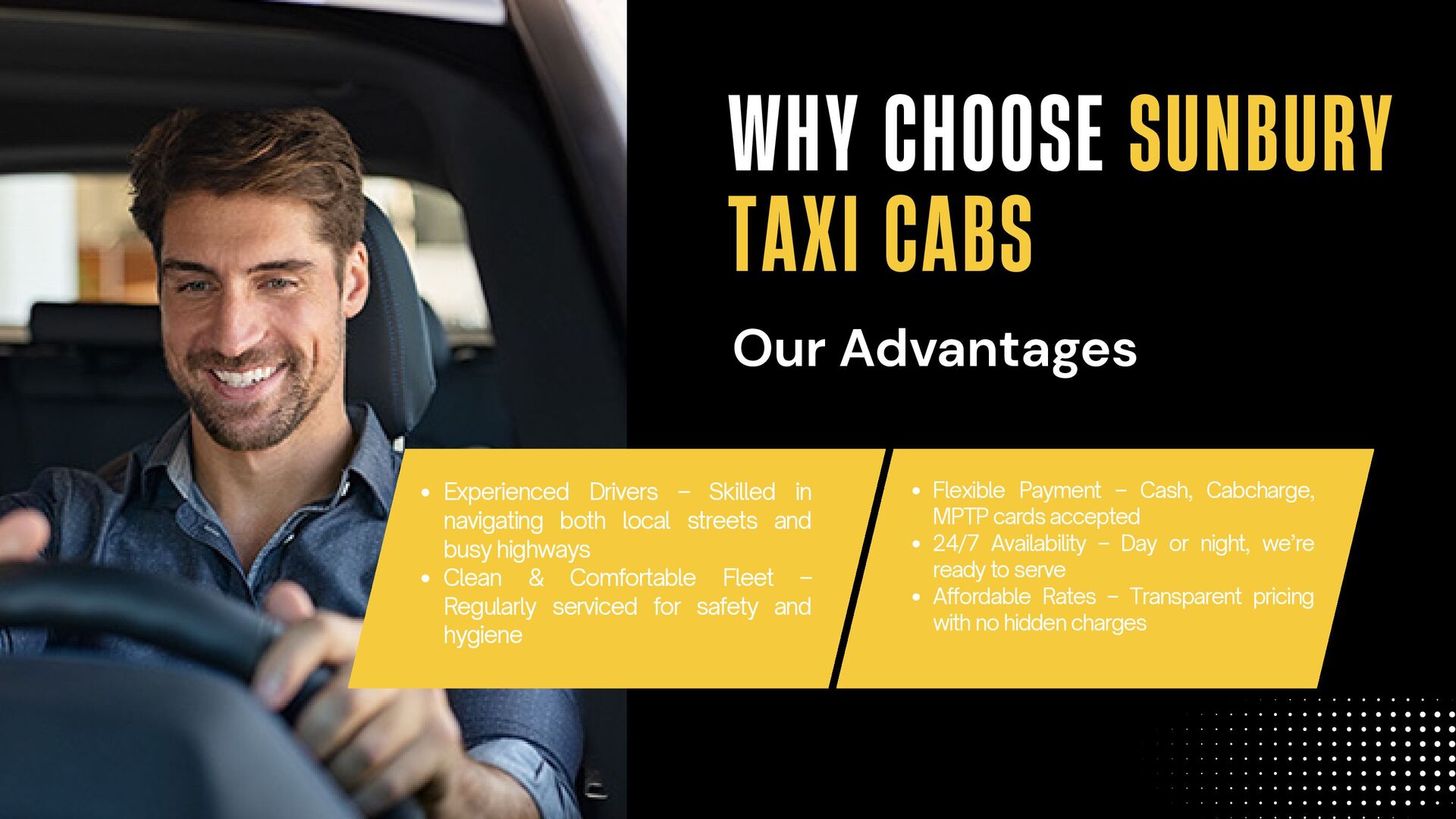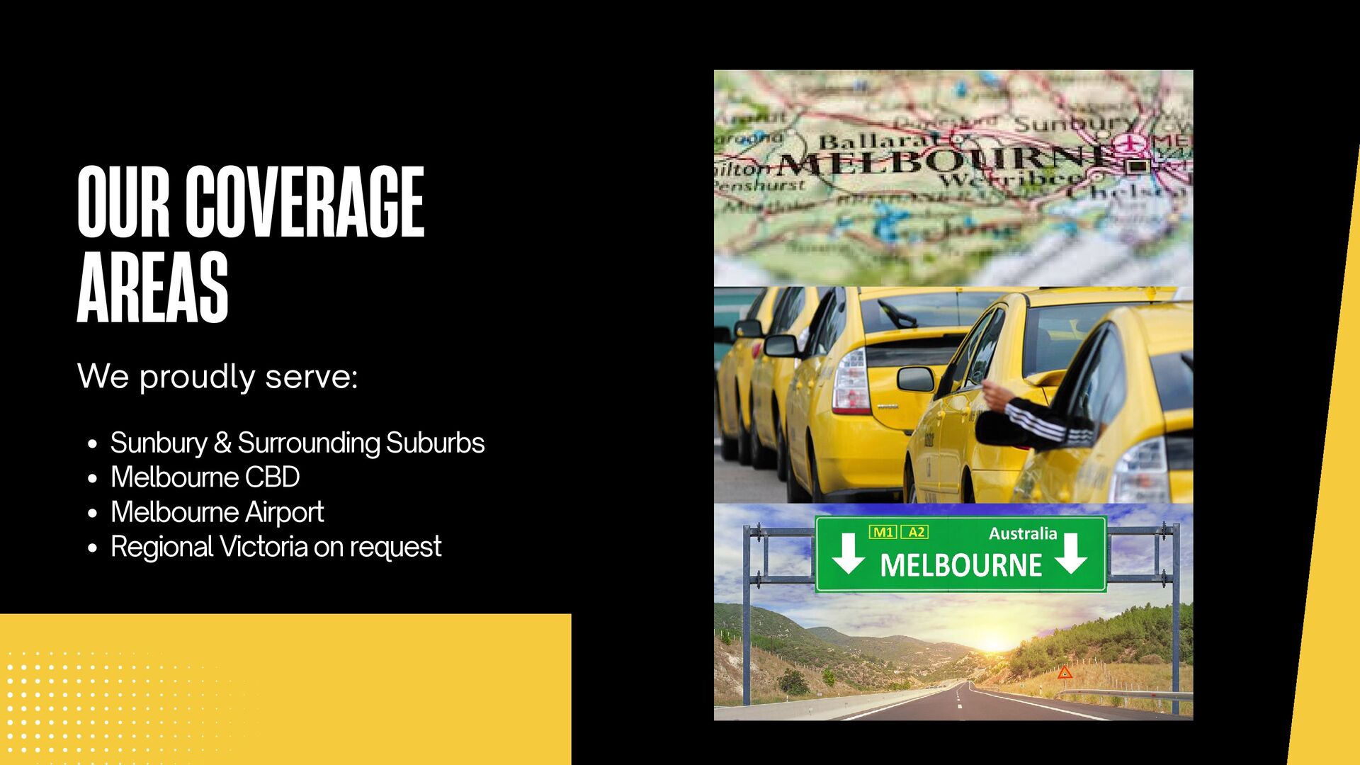At Sunbury Taxi Cabs, we pride ourselves on making your journey easy and hassle-free. Operating in the Sunbury area 24/7, we provide clean, comfortable cabs driven by friendly locals who know the region like the back of their hand. Whether you need a fast local trip, an airport trip, or further afield, we're here to get you there on time and with a smile. With various vehicles to cater to individual riders, families, and groups, you can rely on us for dependable service—anytime, any day.