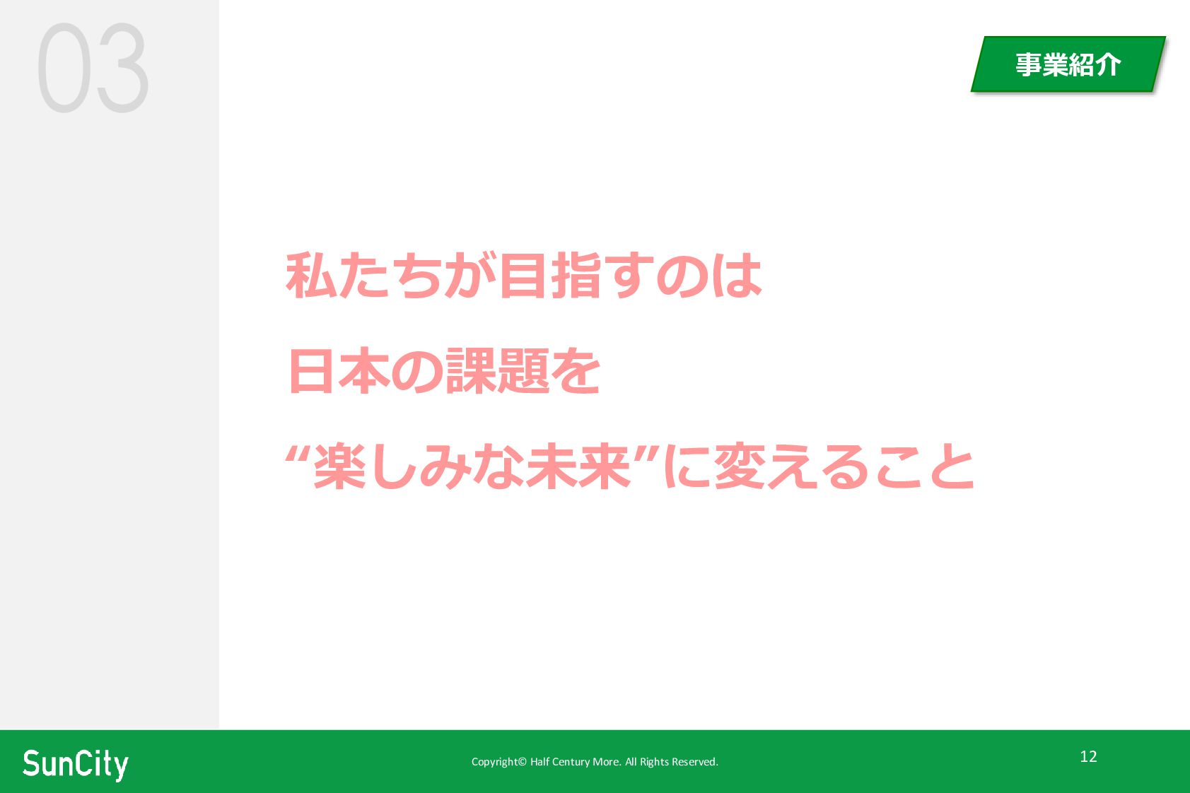 Copyright© Half Century More. All Rights Reserved. 12 私たちが目指すのは 日本の課題を