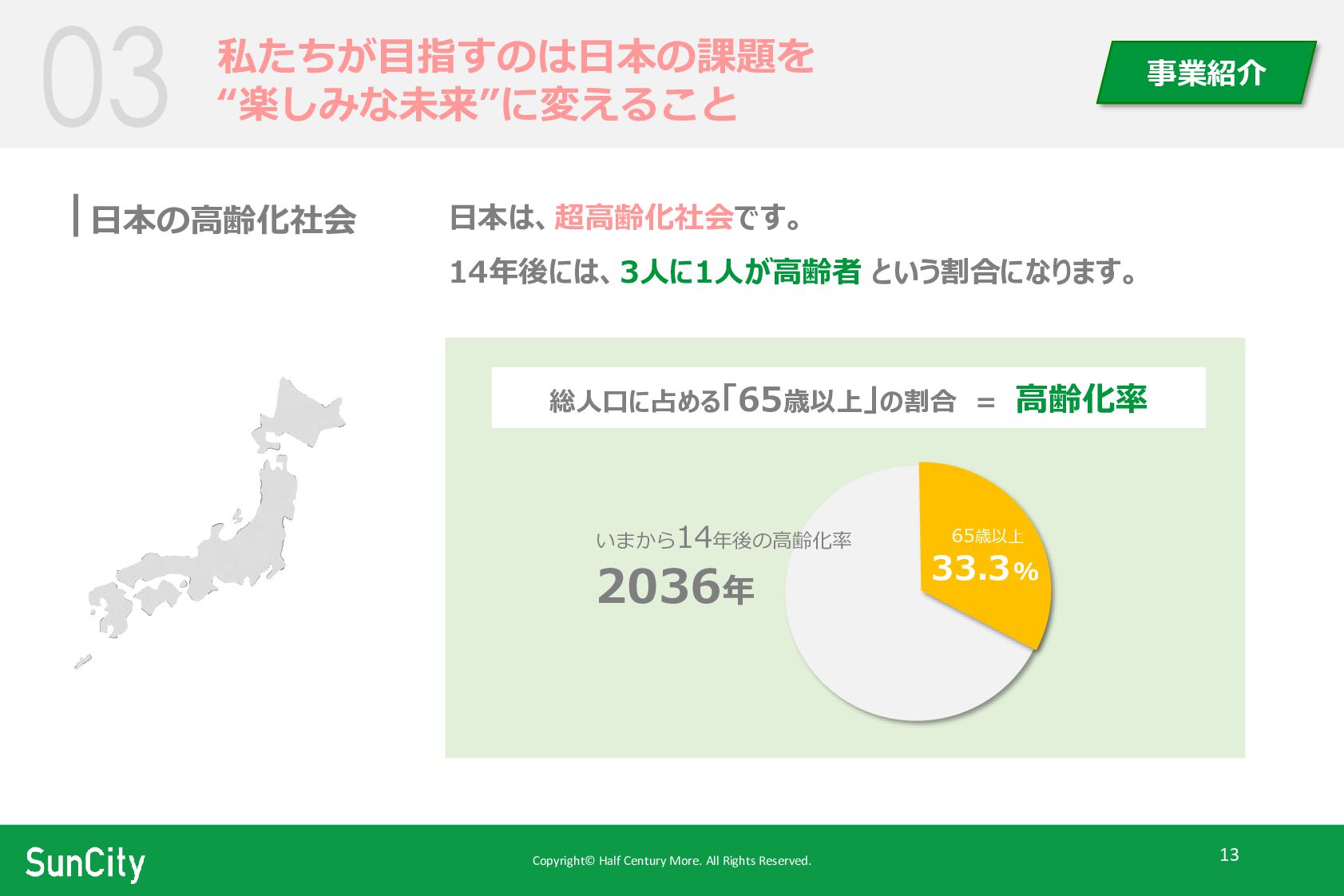 Copyright© Half Century More. All Rights Reserved. 13 私たちが目指すのは日本の課題を “楽しみな未来”に変えること