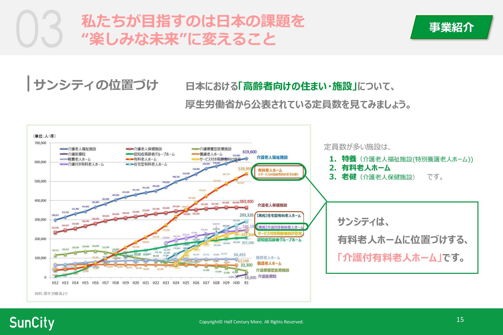 事業紹介 サンシティの位置づけ 日本における「高齢者向けの住まい・施設」について、 厚生労働省から公表されている定員数を見てみましょう。 定員数が多い施設は、 1. 特養(介護老人福祉施設(特別養護老人ホーム)) 2. 有料老人ホーム 3. 老健(介護老人保健施設) です。 資料:厚生労働省より サンシティは、 有料老人ホームに位置づけする、 「介護付有料老人ホーム」です。