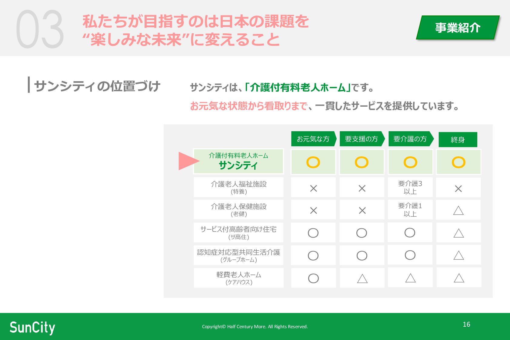 事業紹介 サンシティは、「介護付有料老人ホーム」です。 お元気な状態から看取りまで、一貫したサービスを提供しています。 お元気な方 要支援の方 要介護の方 終身 介護老人福祉施設 (特養) × × 要介護3 以上 △ × × 要介護1 以上 × 介護老人保健施設 (老健) 〇 〇 〇 〇 介護付有料老人ホーム サンシティ サンシティの位置づけ サービス付高齢者向け住宅 (サ高住) 〇 〇 △ 〇 〇 認知症対応型共同生活介護 (グループホーム) 〇 △ 軽費老人ホーム (ケアハウス) 〇 △ △ △ 〇