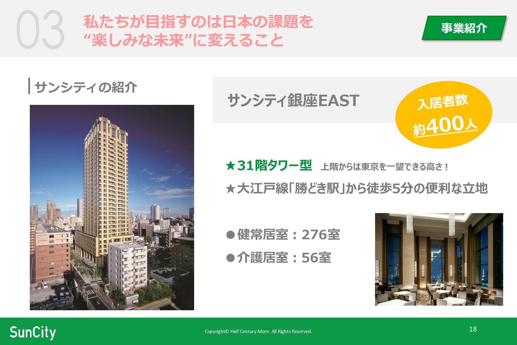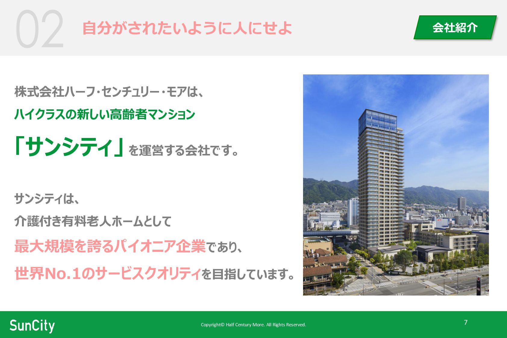 株式会社ハーフ・センチュリー・モアは、 ハイクラスの新しい高齢者マンション 「サンシティ」 を運営する会社です。 サンシティは、 介護付き有料老人ホームとして 最大規模を誇るパイオニア企業であり、 世界No.1のサービスクオリティを目指しています。