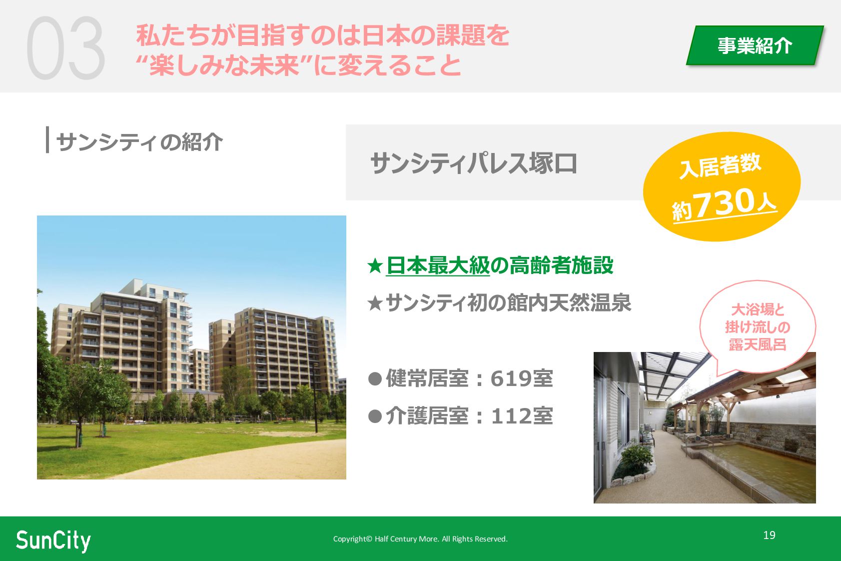 事業紹介 サンシティの紹介 サンシティパレス塚口 ★日本最大級の高齢者施設 ★サンシティ初の館内天然温泉 •健常居室:619室 •介護居室:112室 大浴場と 掛け流しの 露天風呂