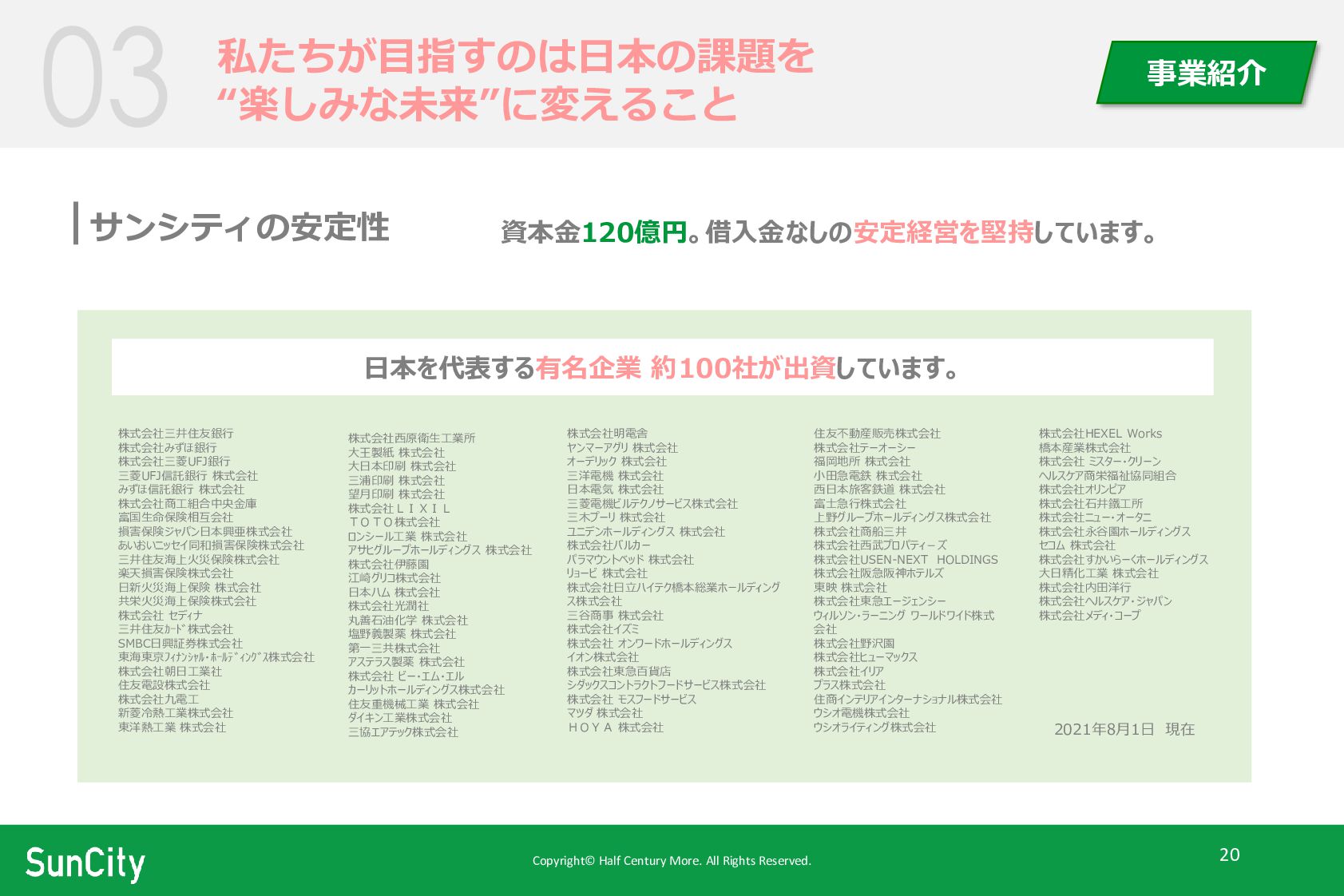 事業紹介 資本金120億円。借入金なしの安定経営を堅持しています。 サンシティの安定性 日本を代表する有名企業 約100社が出資しています。 住友不動産販売株式会社 株式会社テーオーシー 福岡地所 株式会社 小田急電鉄 株式会社 西日本旅客鉄道 株式会社 富士急行株式会社 上野グループホールディングス株式会社 株式会社商船三井 株式会社西武プロパティ-ズ 株式会社USEN-NEXT HOLDINGS 株式会社阪急阪神ホテルズ 東映 株式会社 株式会社東急エージェンシー ウィルソン・ラーニング ワールドワイド株式 会社 株式会社野沢園 株式会社ヒューマックス 株式会社イリア プラス株式会社 住商インテリアインターナショナル株式会社 ウシオ電機株式会社 ウシオライティング株式会社 株式会社三井住友銀行 株式会社みずほ銀行 株式会社三菱UFJ銀行 三菱UFJ信託銀行 株式会社 みずほ信託銀行 株式会社 株式会社商工組合中央金庫 富国生命保険相互会社 損害保険ジャパン日本興亜株式会社 あいおいニッセイ同和損害保険株式会社 三井住友海上火災保険株式会社 楽天損害保険株式会社 日新火災海上保険 株式会社 共栄火災海上保険株式会社 株式会社 セディナ 三井住友カード株式会社 SMBC日興証券株式会社 東海東京フィナンシャル・ホールディングス株式会社 株式会社朝日工業社 住友電設株式会社 株式会社九電工 新菱冷熱工業株式会社 東洋熱工業 株式会社 株式会社西原衛生工業所 大王製紙 株式会社 大日本印刷 株式会社 三浦印刷 株式会社 望月印刷 株式会社 株式会社LIXIL TOTO株式会社 ロンシール工業 株式会社 アサヒグループホールディングス 株式会社 株式会社伊藤園 江崎グリコ株式会社 日本ハム 株式会社 株式会社光潤社 丸善石油化学 株式会社 塩野義製薬 株式会社 第一三共株式会社 アステラス製薬 株式会社 株式会社 ビー・エム・エル カーリットホールディングス株式会社 住友重機械工業 株式会社 ダイキン工業株式会社 三協エアテック株式会社 株式会社明電舎 ヤンマーアグリ 株式会社 オーデリック 株式会社 三洋電機 株式会社 日本電気 株式会社 三菱電機ビルテクノサービス株式会社 三木プーリ 株式会社 ユニデンホールディングス 株式会社 株式会社バルカー パラマウントベッド 株式会社 リョービ 株式会社 株式会社日立ハイテク橋本総業ホールディング ス株式会社 三谷商事 株式会社 株式会社イズミ 株式会社 オンワードホールディングス イオン株式会社 株式会社東急百貨店 シダックスコントラクトフードサービス株式会社 株式会社 モスフードサービス マツダ 株式会社 HOYA 株式会社 株式会社HEXEL Works 橋本産業株式会社 株式会社 ミスター・クリーン ヘルスケア商栄福祉協同組合 株式会社オリンピア 株式会社石井鐵工所 株式会社ニュー・オータニ 株式会社永谷園ホールディングス セコム 株式会社 株式会社すかいらーくホールディングス 大日精化工業 株式会社 株式会社内田洋行 株式会社ヘルスケア・ジャパン 株式会社メディ・コープ 2021年8月1日 現在