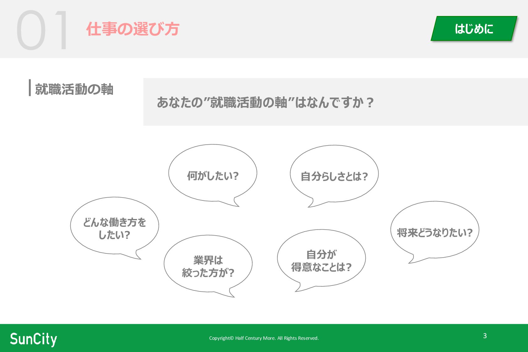 Copyright© Half Century More. All Rights Reserved. 3 仕事の選び方 就職活動の軸
