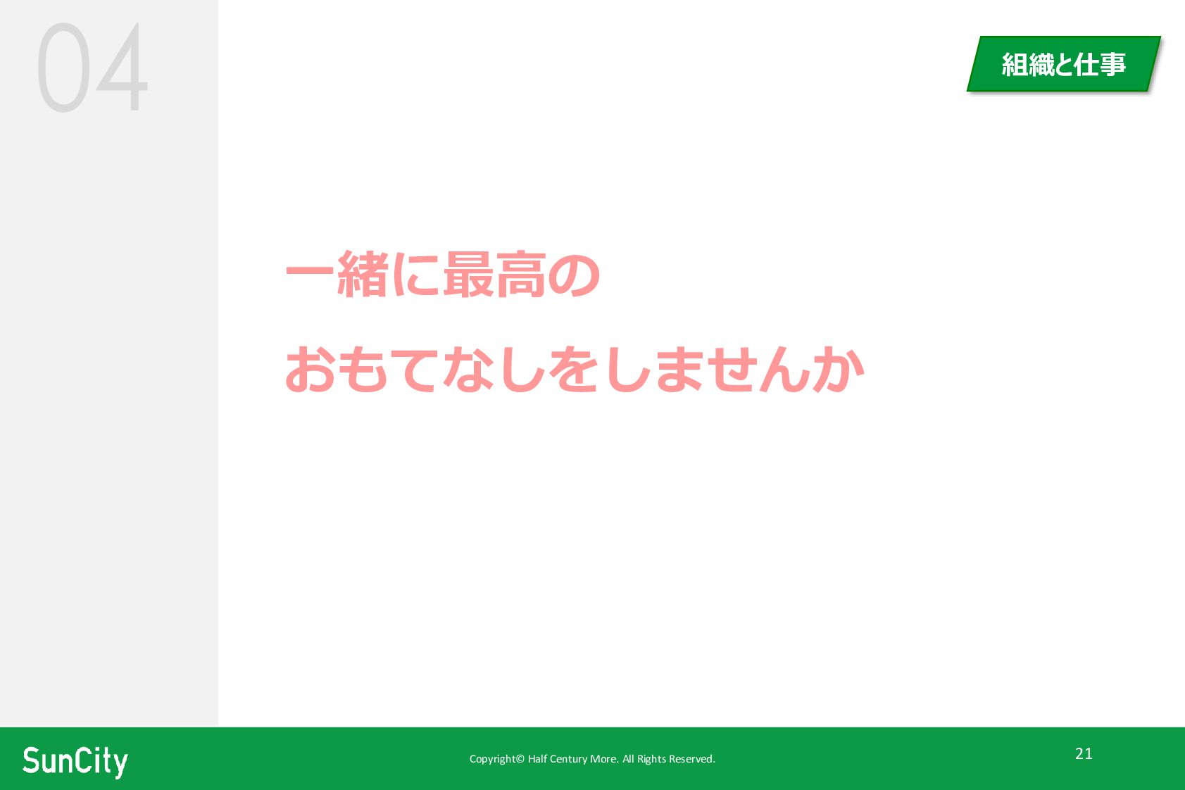 Copyright© Half Century More. All Rights Reserved. 21 一緒に最高の おもてなしをしませんか