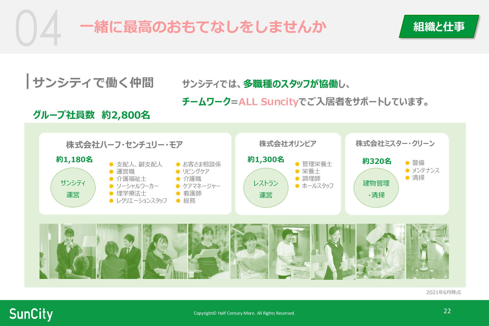 サンシティでは、多職種のスタッフが協働し、 チームワーク=ALL Suncityでご入居者をサポートしています。 サンシティで働く仲間 2021年6月時点 グループ社員数 約2,800名 株式会社ハーフ・センチュリー・モア サンシティ 運営 レストラン 運営 建物管理 ・清掃 株式会社オリンピア 株式会社ミスター・クリーン 約1,180名 約1,300名 約320名 • 支配人、副支配人 • お客さま相談係 • 運営職 • リビングケア • 介護福祉士 • 介護職 • ソーシャルワーカー • ケアマネージャー • 理学療法士 • 看護師 • レクリエーションスタッフ • 総務 • 管理栄養士 • 栄養士 • 調理師 • ホールスタッフ • 警備 • メンテナンス • 清掃