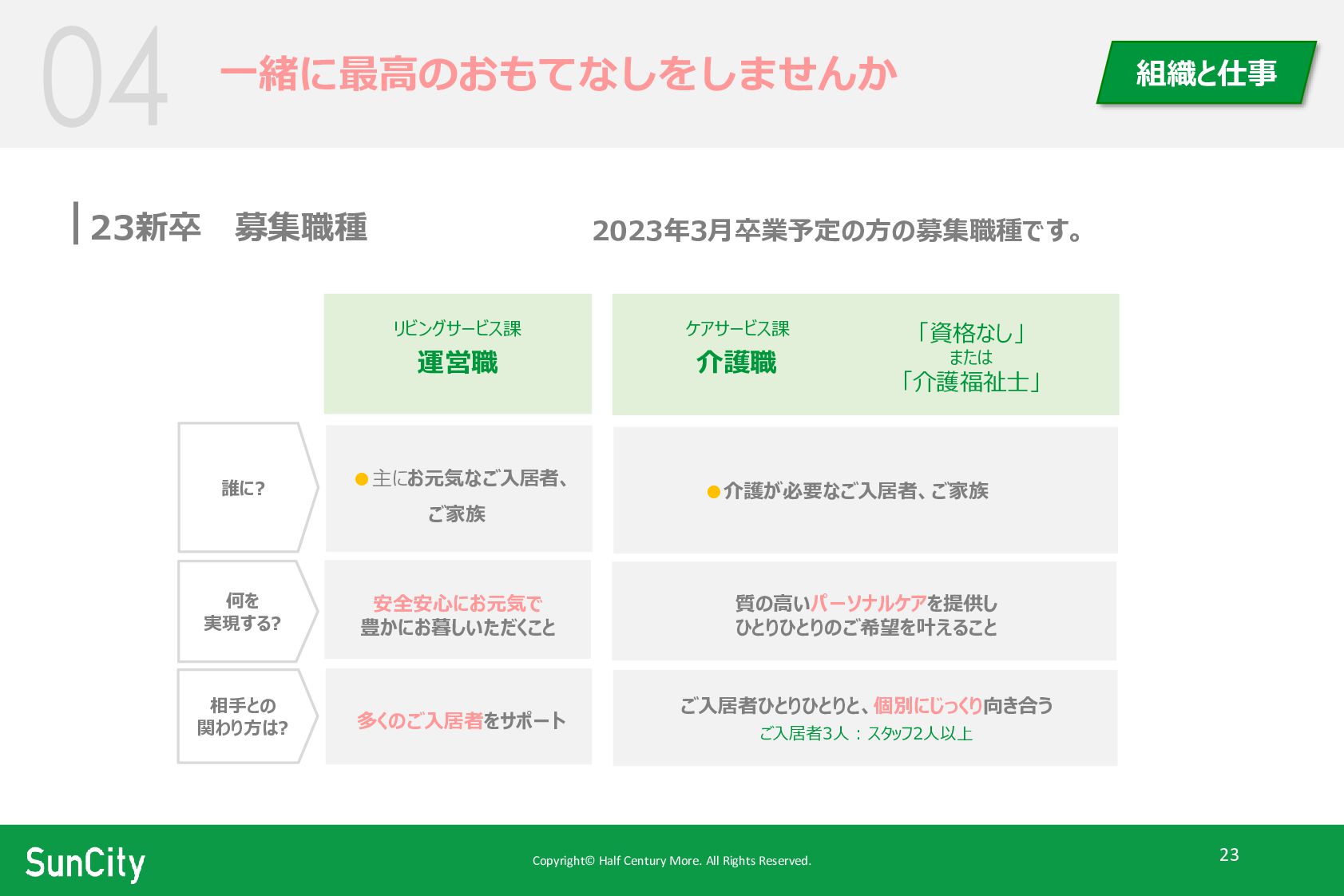 Copyright© Half Century More. All Rights Reserved. 23 一緒に最高のおもてなしをしませんか 組織と仕事