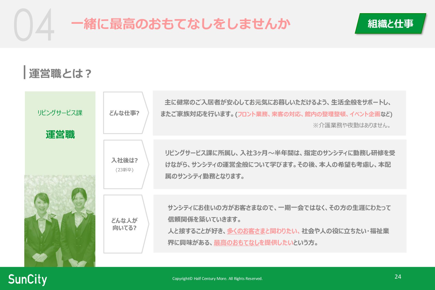 Copyright© Half Century More. All Rights Reserved. 24 一緒に最高のおもてなしをしませんか 組織と仕事