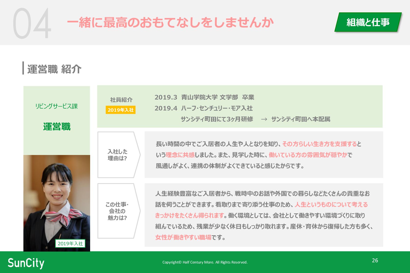 Rights Reserved. 26 一緒に最高のおもてなしをしませんか 組織と仕事 運営職 紹介 リビングサービス課 運営職 2019.3 青山学院大学 文学部 卒業 2019.4 ハーフ・センチュリー・モア入社 サンシティ町田にて3ヶ月研修 → サンシティ町田へ本配属 長い時間の中でご入居者の人生や人となりを知り、その方らしい生き方を支援すると いう理念に共感しました。また、見学した時に、働いている方の雰囲気が穏やかで 風通しがよく、連携の体制がよくできていると感じたからです。 人生経験豊富なご入居者から、戦時中のお話や外国での暮らしなどたくさんの貴重なお 話を伺うことができます。看取りまで寄り添う仕事のため、人生というものについて考える きっかけをたくさん得られます。働く環境としては、会社として働きやすい環境づくりに取り 組んでいるため、残業が少なく休日もしっかり取れます。産休・育休から復帰した方も多く、 女性が働きやすい職場です。 2019年入社 社員紹介 2019年入社