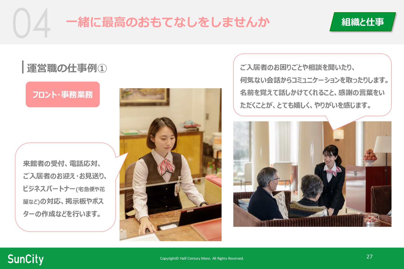 Copyright© Half Century More. All Rights Reserved. 27 一緒に最高のおもてなしをしませんか 組織と仕事