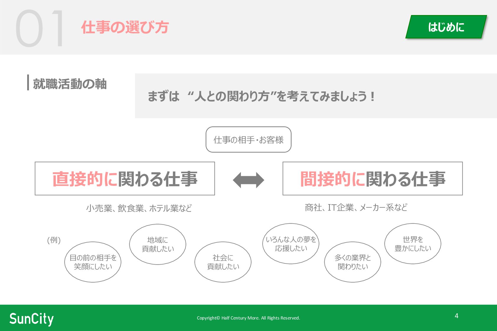 Copyright© Half Century More. All Rights Reserved. 4 就職活動の軸 直接的に関わる仕事