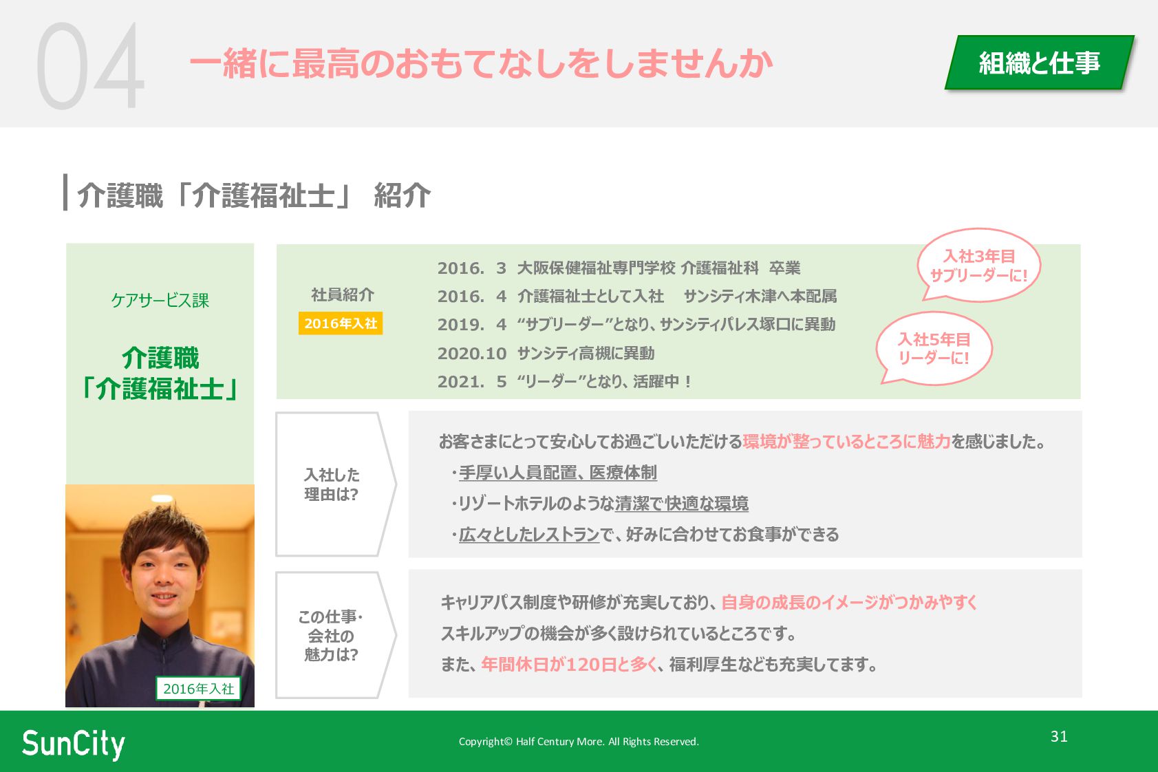 31 一緒に最高のおもてなしをしませんか 組織と仕事 介護職「介護福祉士」 紹介 2016. 3 大阪保健福祉専門学校 介護福祉科 卒業 2016. 4 介護福祉士として入社 サンシティ木津へ本配属 2019. 4 “サブリーダー”となり、サンシティパレス塚口に異動 2020.10 サンシティ高槻に異動 2021. 5 “リーダー”となり、活躍中! 社員紹介 入社した 理由は? この仕事・ 会社の 魅力は? お客さまにとって安心してお過ごしいただける環境が整っているところに魅力を感じました。 ・手厚い人員配置、医療体制 ・リゾートホテルのような清潔で快適な環境 ・広々としたレストランで、好みに合わせてお食事ができる キャリアパス制度や研修が充実しており、自身の成長のイメージがつかみやすく スキルアップの機会が多く設けられているところです。 また、年間休日が120日と多く、福利厚生なども充実してます。 2016年入社 入社5年目 リーダーに! 2016年入社 入社3年目 サブリーダーに!